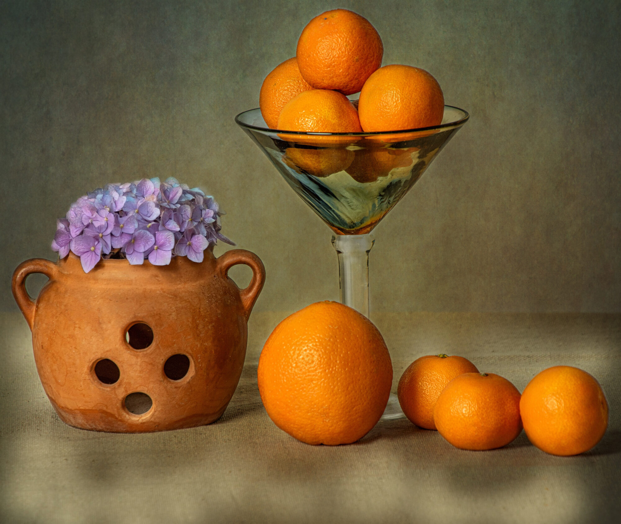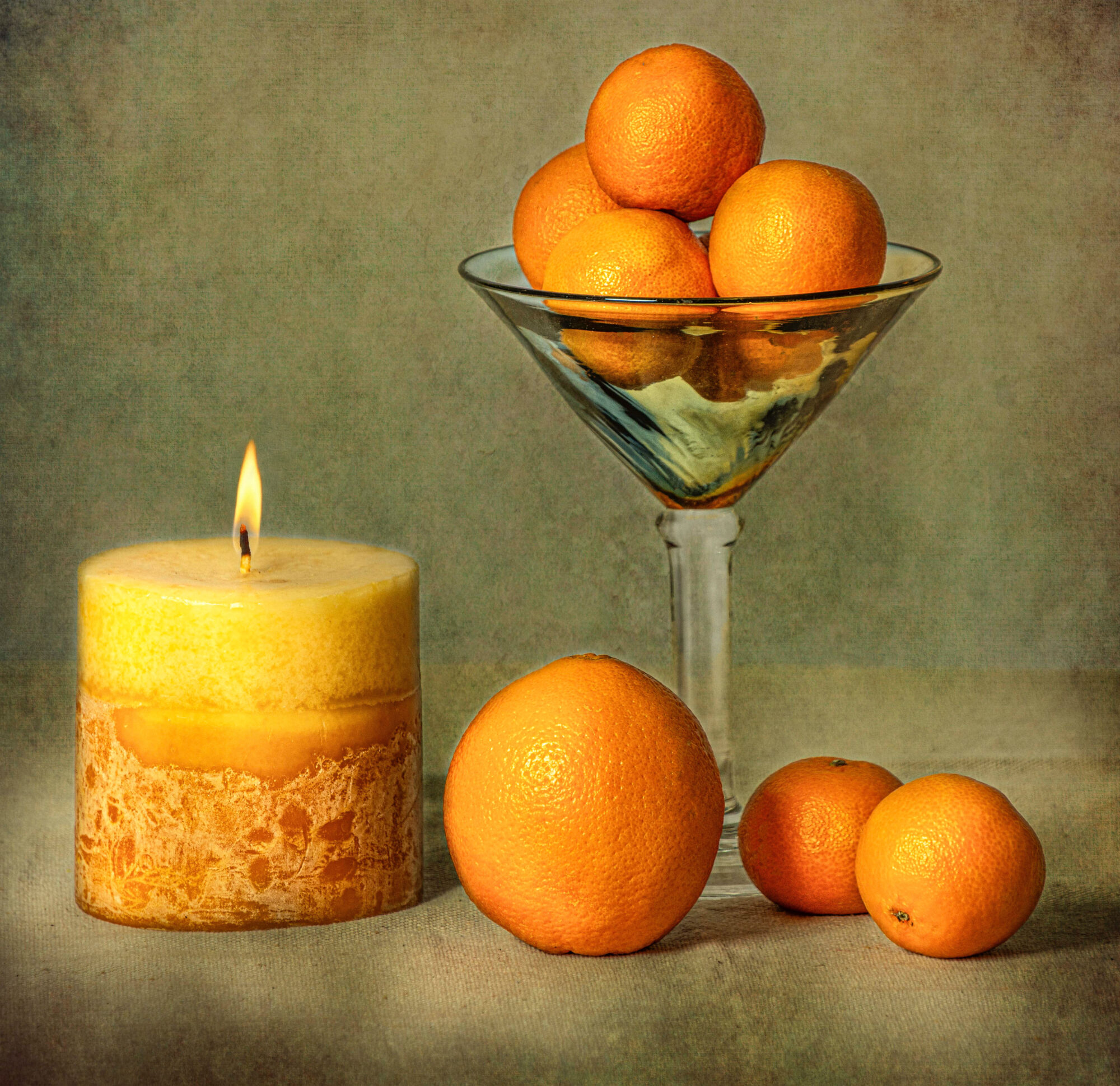 I wanted to create an inviting scene using mandarin oranges and a beautiful martini glass. I placed four oranges inside the greenish glass and added two small oranges at the base. I added a large orange at the base as well. A lit orange candle sits beside the oranges. I enhanced the background by adding a warm texture. The result is a simple picture that exudes warm lighting and gives the scene a cozy and inviting atmosphere.