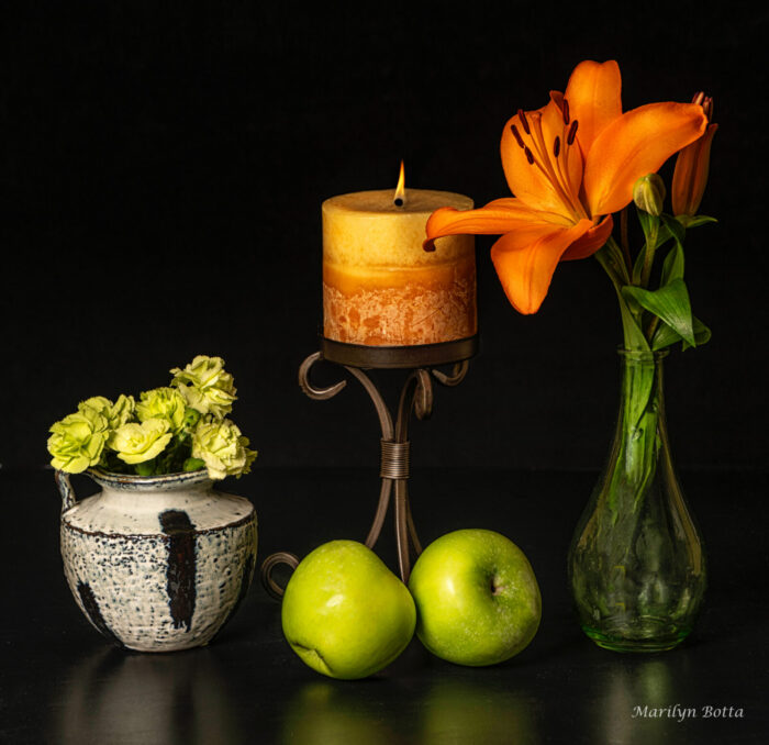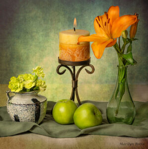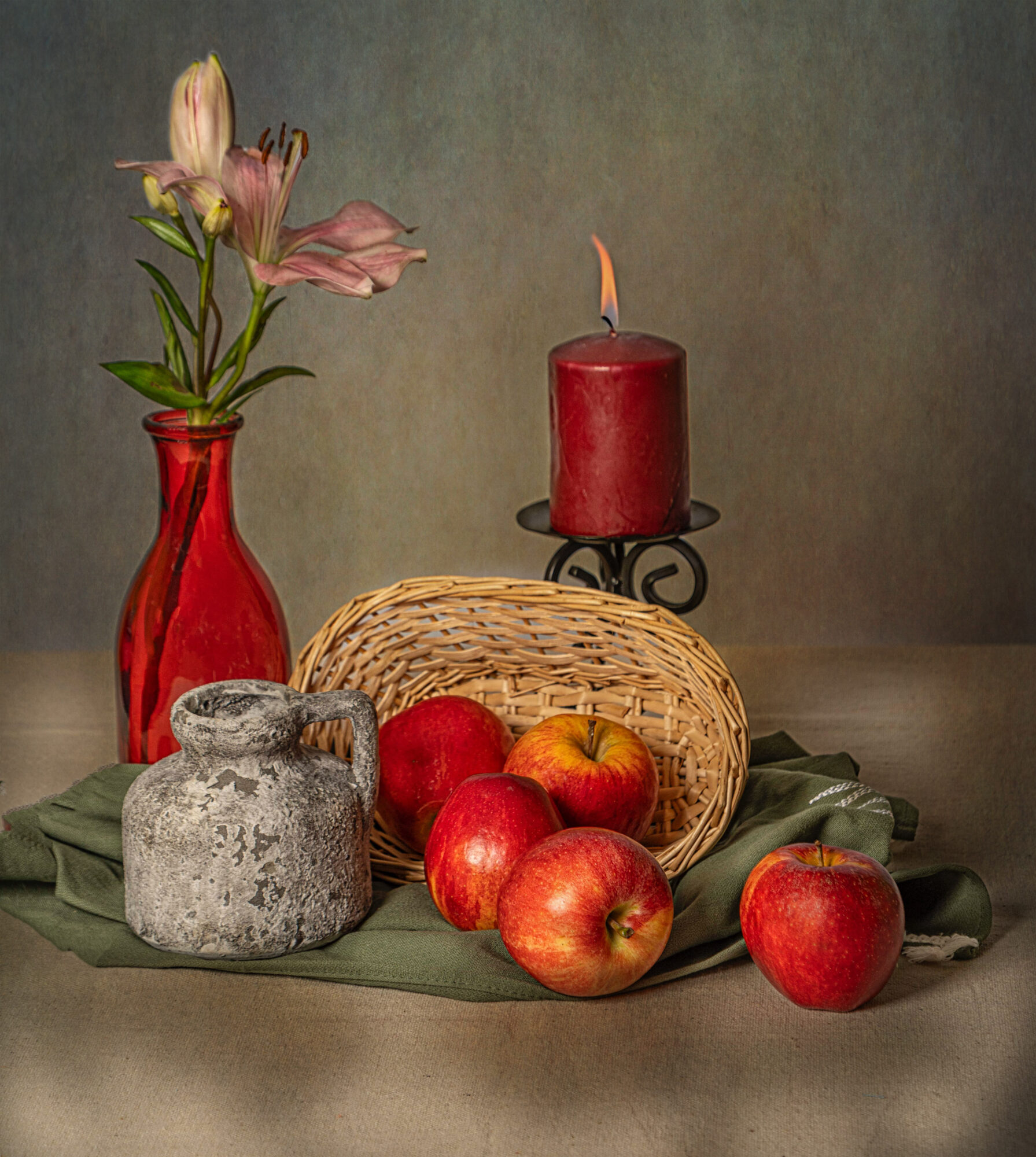 I wanted to create a rustic composition that had both warmth and elegance. I assembled a pretty glass red vase and added pink lilies. I matched the red vase with a lit red candle on a pewter holder. I added red apples spilling out of a wicker basket. I then arranged these gorgeous elements on a green cloth for contrast. I added a complementary texture to highlight the beauty of this composition.