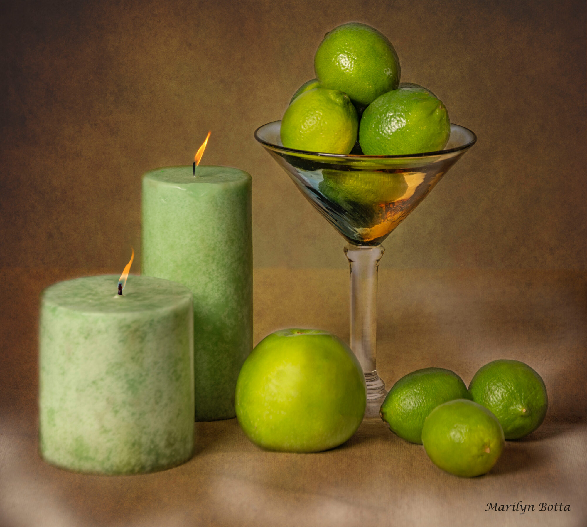 I placed a collection of fresh green limes inside a martini glass. A lit green candle and a green apple accompany the arrangement, creating a harmonious composition.
