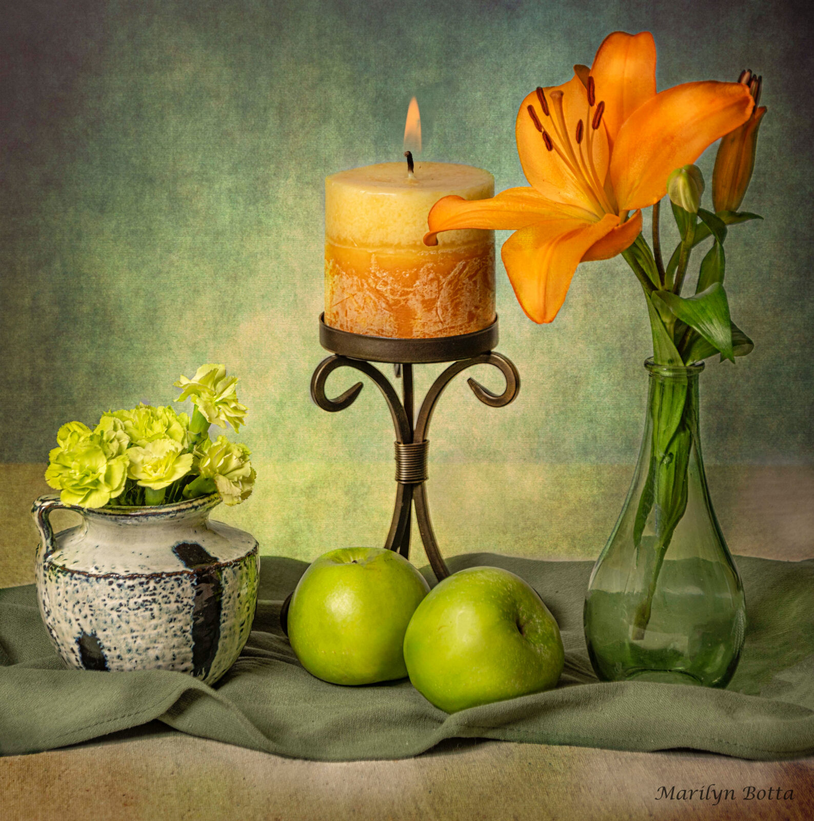 It is Fall and what says Fall other than orange pumpkins. I placed mini pumpkins into a martini glass, and added a green wax candle with flame. Yellow lilies in a green glass vase completed the basic composition. I then added a light blue texture for the background, which creates a warm and cozy scene.