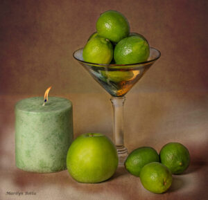 In creating this still life, I wanted to use beautiful contrasting colors to bring out the green of the limes, and the vase. I added the pink lilies to the glass vase, and placed the limes into the goblet one by one. I added a black and white ceramic jug along with a black chess piece. This beautiful arrangement was placed on a green and white cloth. To complete the theme, I created a bluish, green texture for the background.