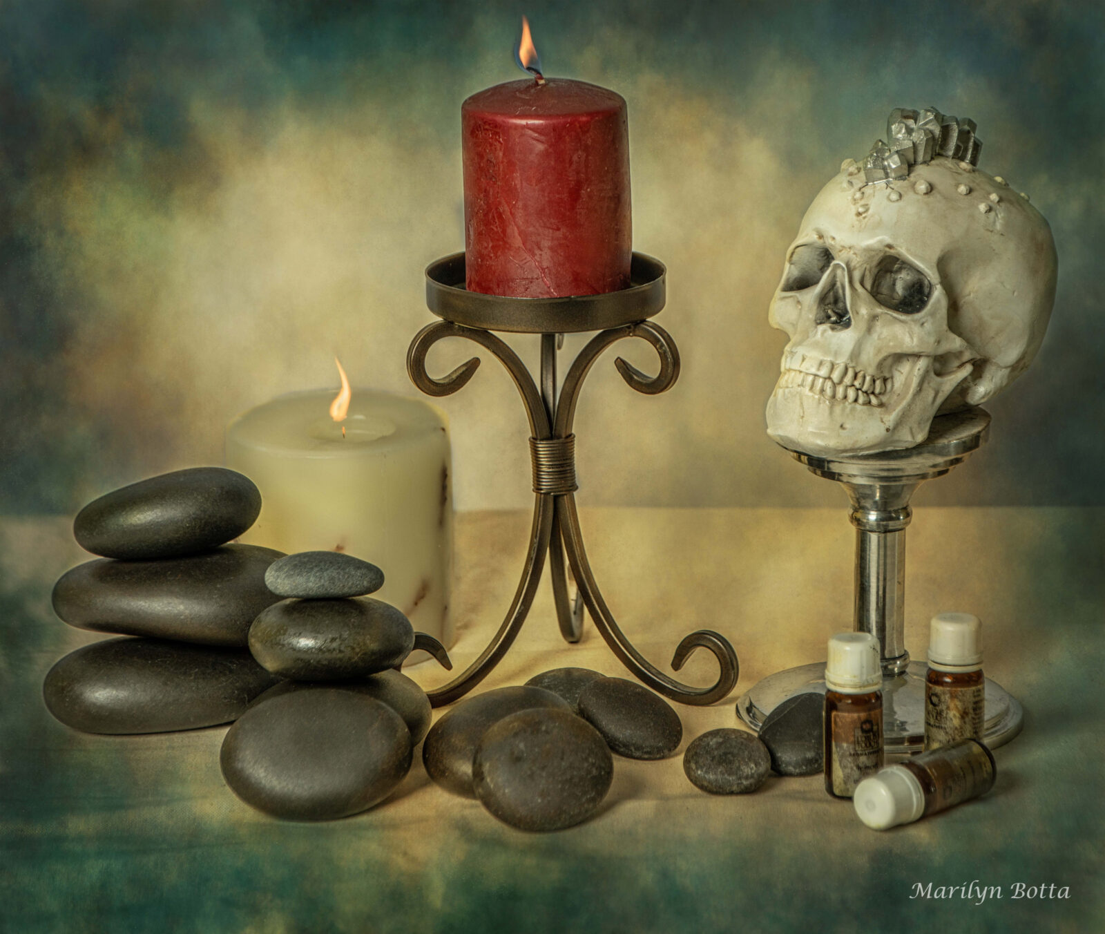 I came upon these two Venetian masks in Goodwill. I was drawn to them and felt these beauties would make an unusual and vibrant image.These pair of Venetian-style masks are displayed prominently, one adorned with colorful details and the other in a stark black and white motif. A bouquet of red alstroemeria flowers and a single red rose add a vibrant touch to the composition, while a lit red candle provides a warm glow from the side. I placed the red candle atop an hourglass containing white sand. I photographed this arrangement against a white backdrop and added a lovely blue texture to create an etherial, otherworldly look.
