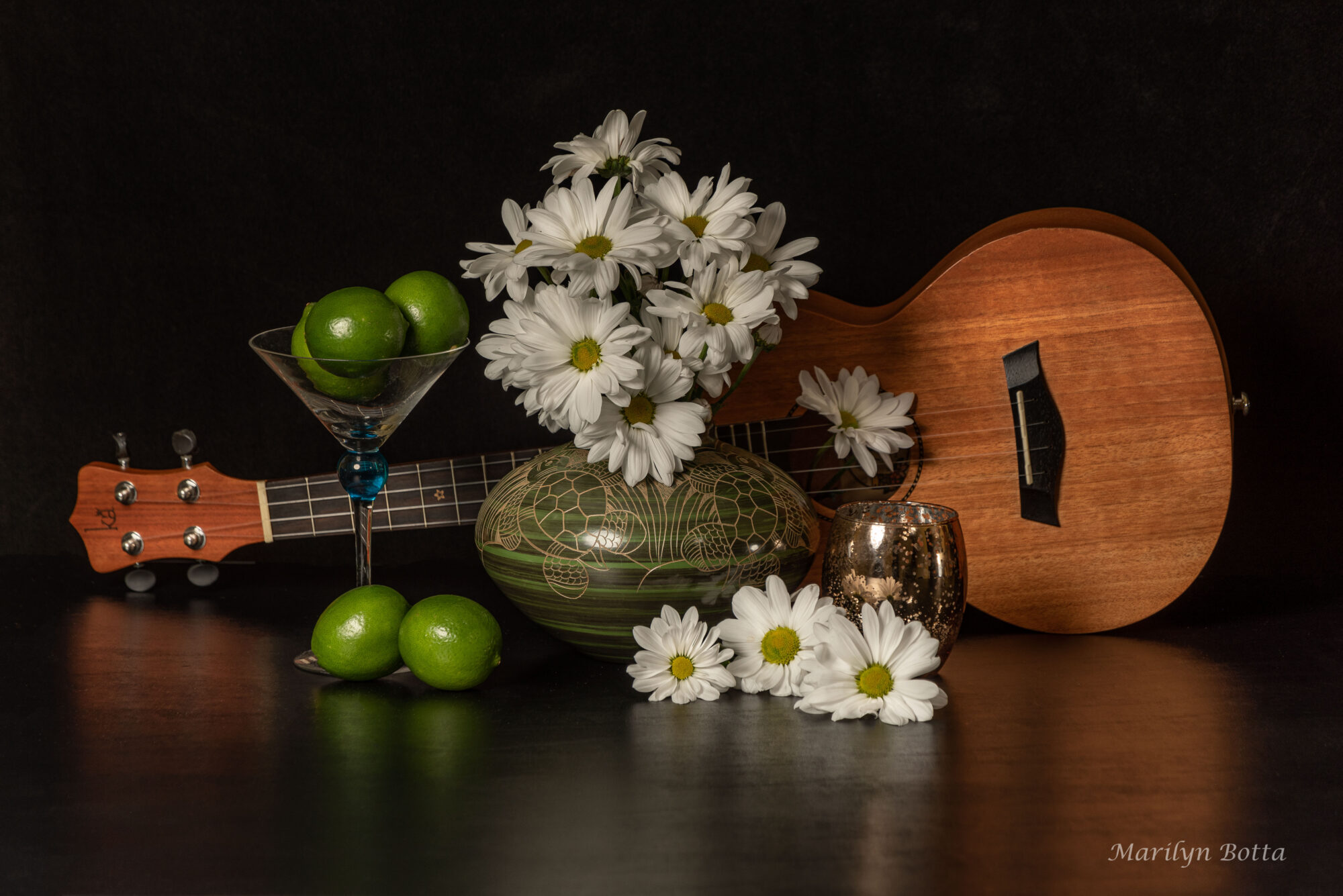 I purchased some beautiful orange lilies. I decided to use them in some Still Life photos featuring a green hat, green vases, Bosc pears, and a ukulele my friend loaned me. I photographed these images against a black background so they would pop. I rather like them and I sure hope you do too.
