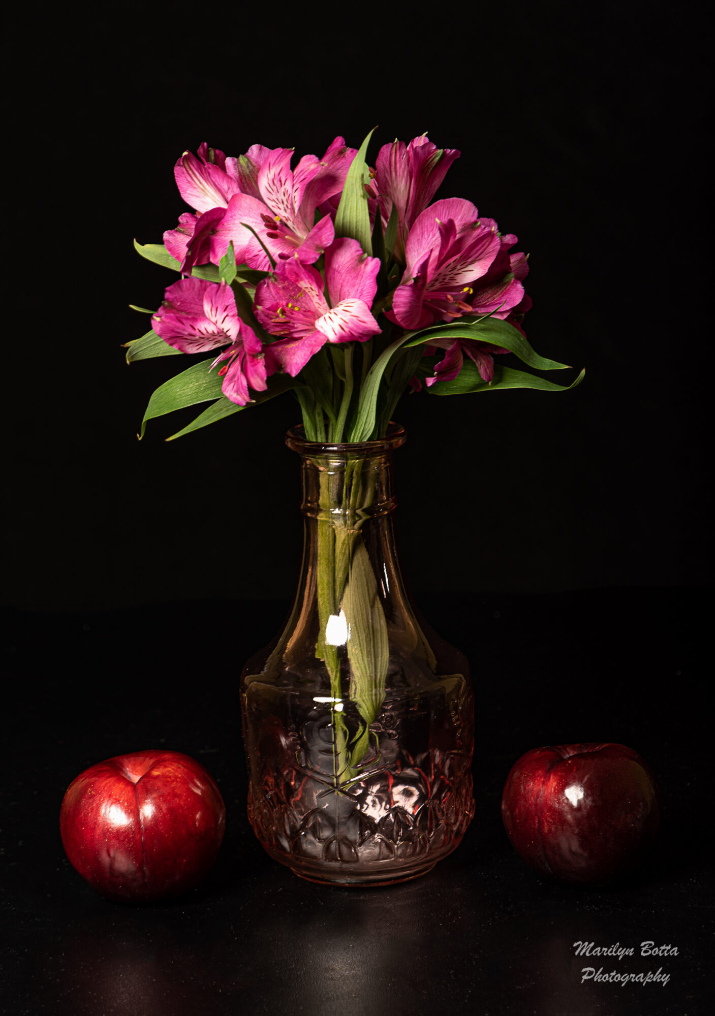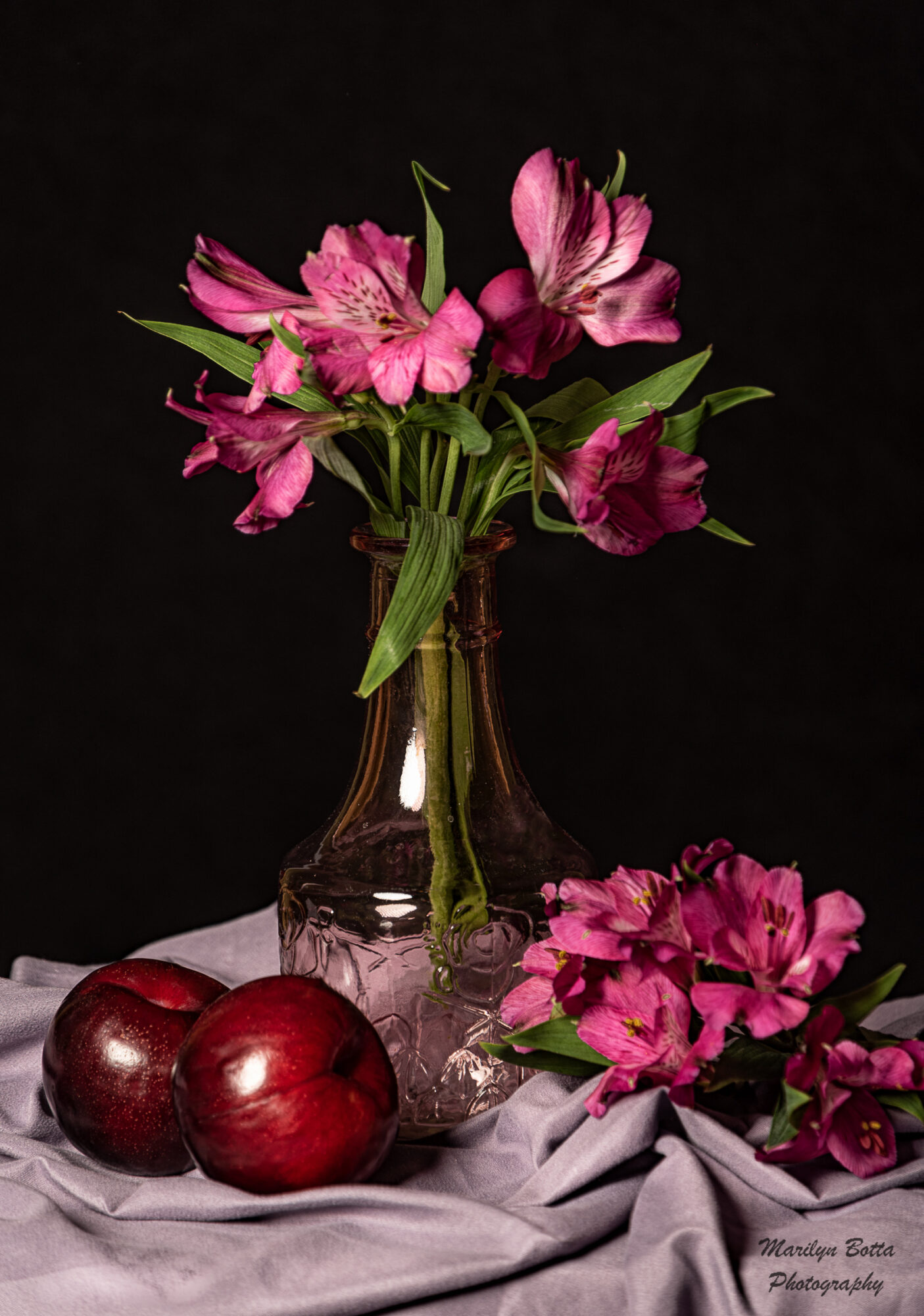 I bought some gorgeous purple flowers (Alstroemeria/Peruvian lilies) and plums to complete the purple theme. I added a purple cloth. Some I took against a black background, and some against a white one and added a texture. I like them both. Hopefully you can choose which one you like best.