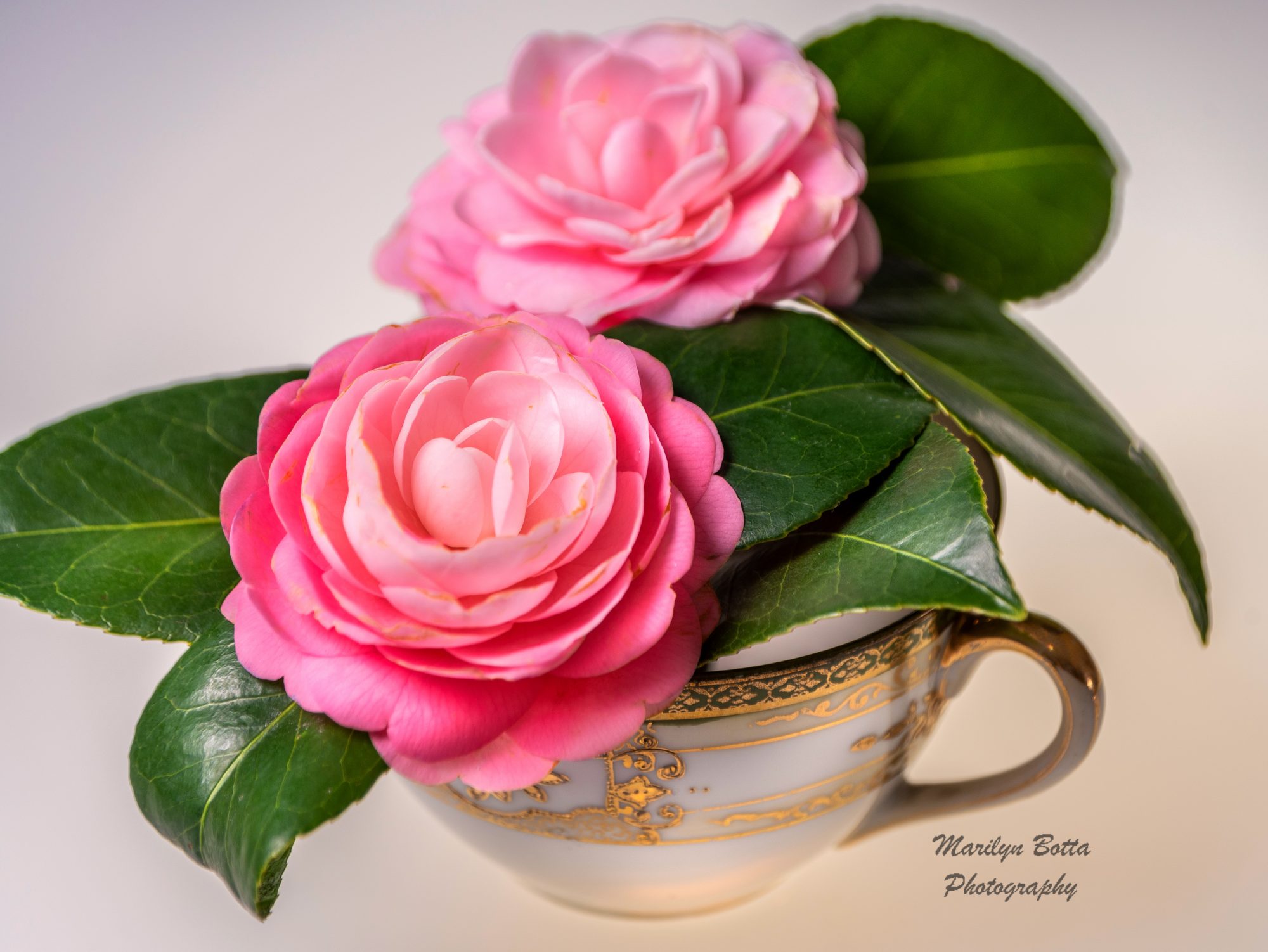 I have an endless fascination with flowers, particularly pink ones. My friend Fran had these gorgeous pink flowers blooming right on a bush in her back yard back in late February. She gave me permission to cut a few off the bush. In the studio I placed the flower against a black reflective surface and used my strobes. The other shots were lilies in my studio in March 2019, again on a black reflective surface. The flowers in the saucer were on a white background so I added a texture to punch things up.