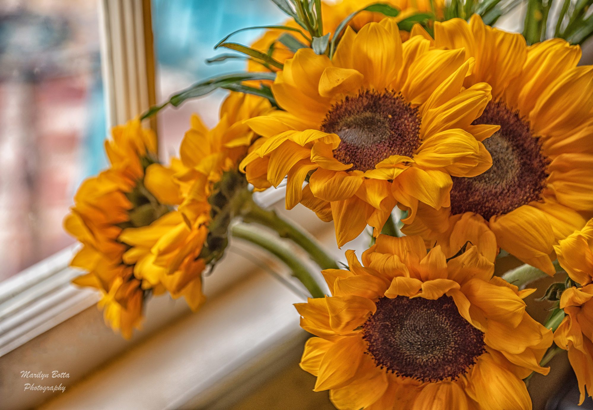 I was up visiting my family in New Jersey in November. My son had bought some beautiful sunflowers for the kitchen table to brighten up the room. I often photograph flowers in the studio setting using strobe lights. But on this day the light coming in through the window was so inviting that I decided to place the vase on the garbage can, right next to the window. These are the best of the shots that I took that day using natural window light–no flash.