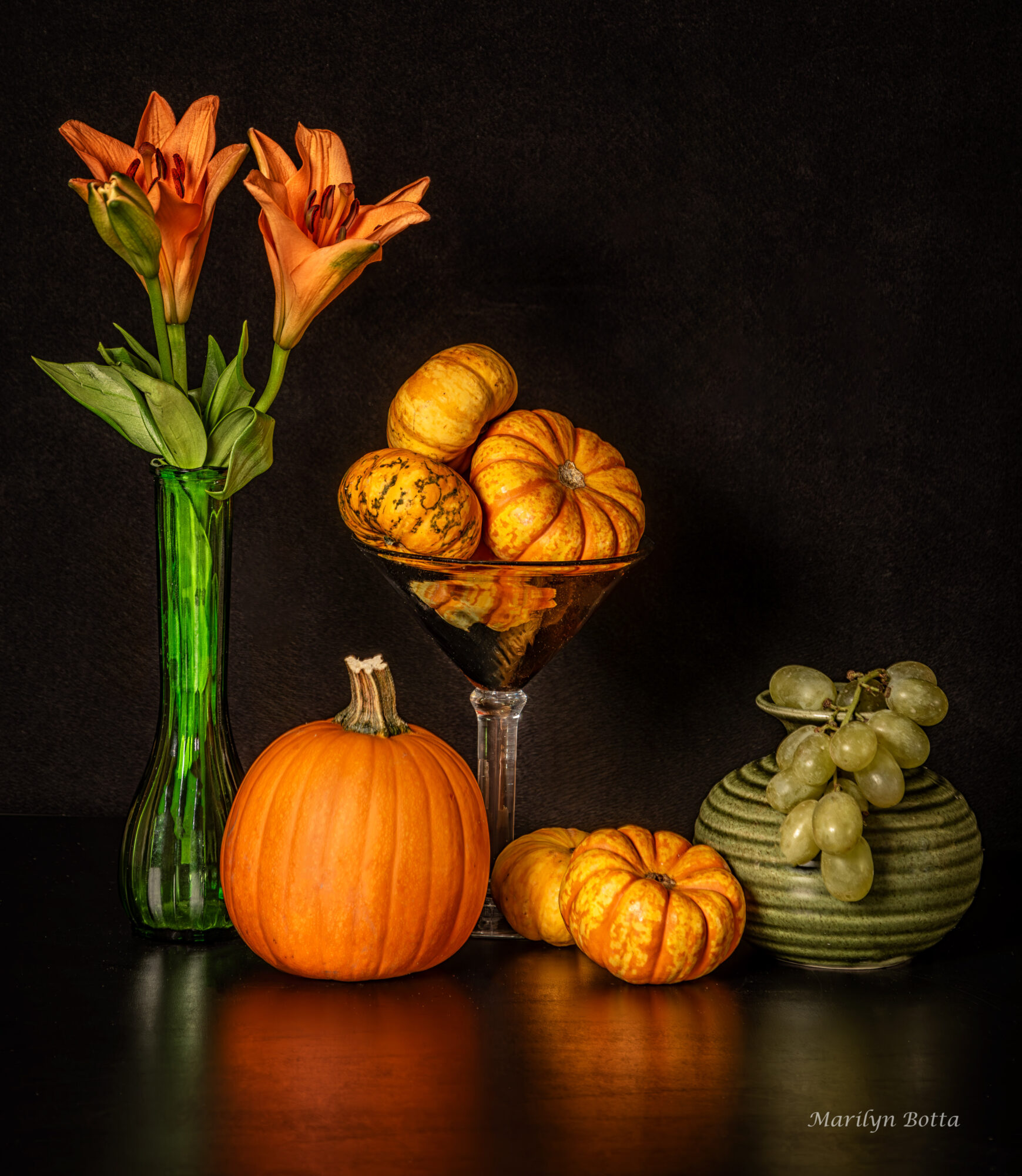 What says Halloween more than pumpkins and skeletons. I placed some mini pumpkins in a glass goblet. A rich orange pumpkin and a small cross-legged skeleton sit together. A lit orange candle on an iron candle-holder adds warmth to this autumn themed scene. I photographed this against a white backdrop and added a greenish texture post-processing.