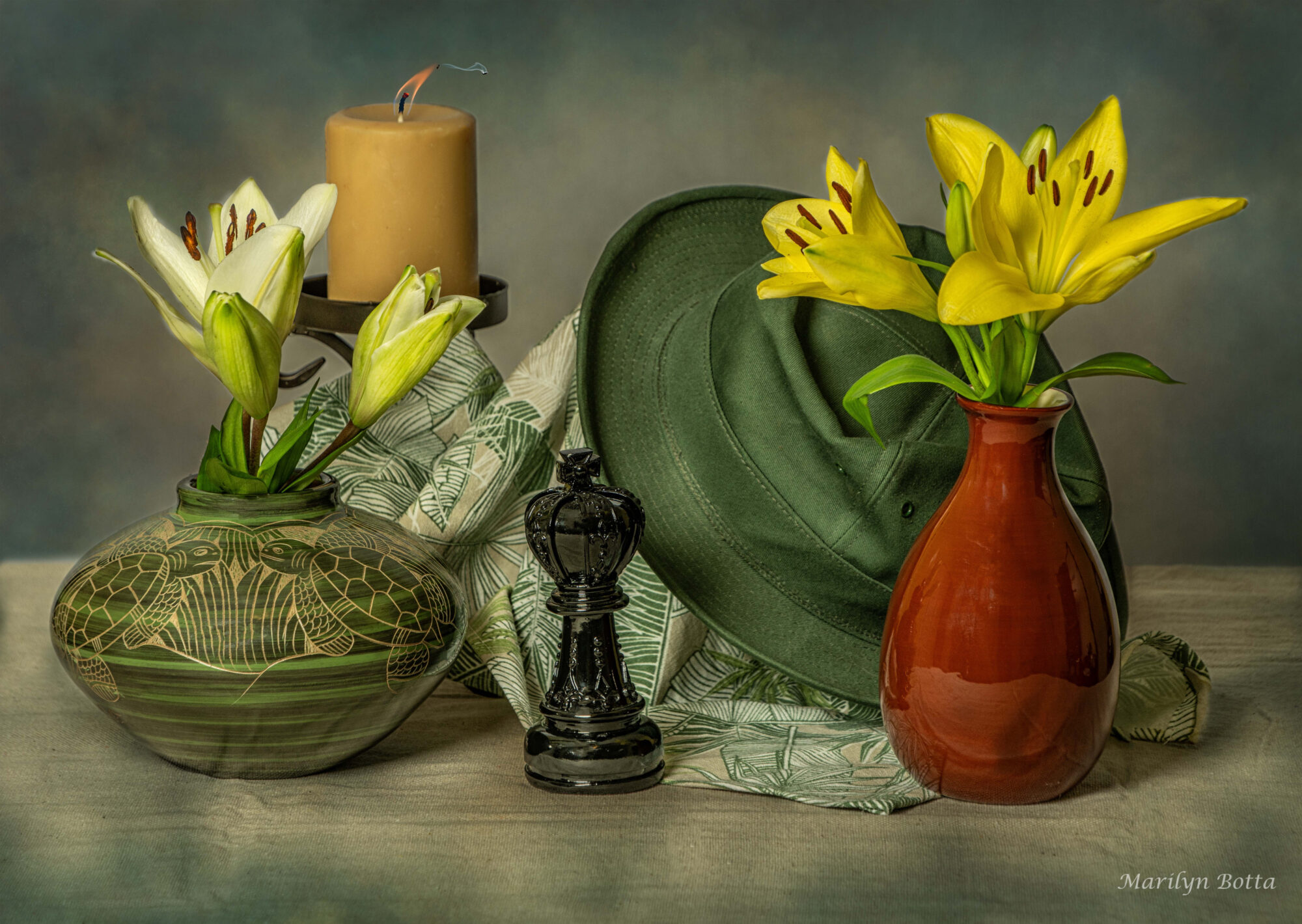 I found an orange wax candle, and a peach and cream colored ceramic vase while looking for items to use in my still life. The vase was matched with some gorgeous orange lilies which offset the orange in the candle. Two red apples were placed at the base of the candle holder, and added a gray stone vase with little baby yellow carnations was added. The entire composition was offset by a beautiful texture I added as a background. There is a lovely contrast between the rustic vases and the vibrant colors of the flowers.