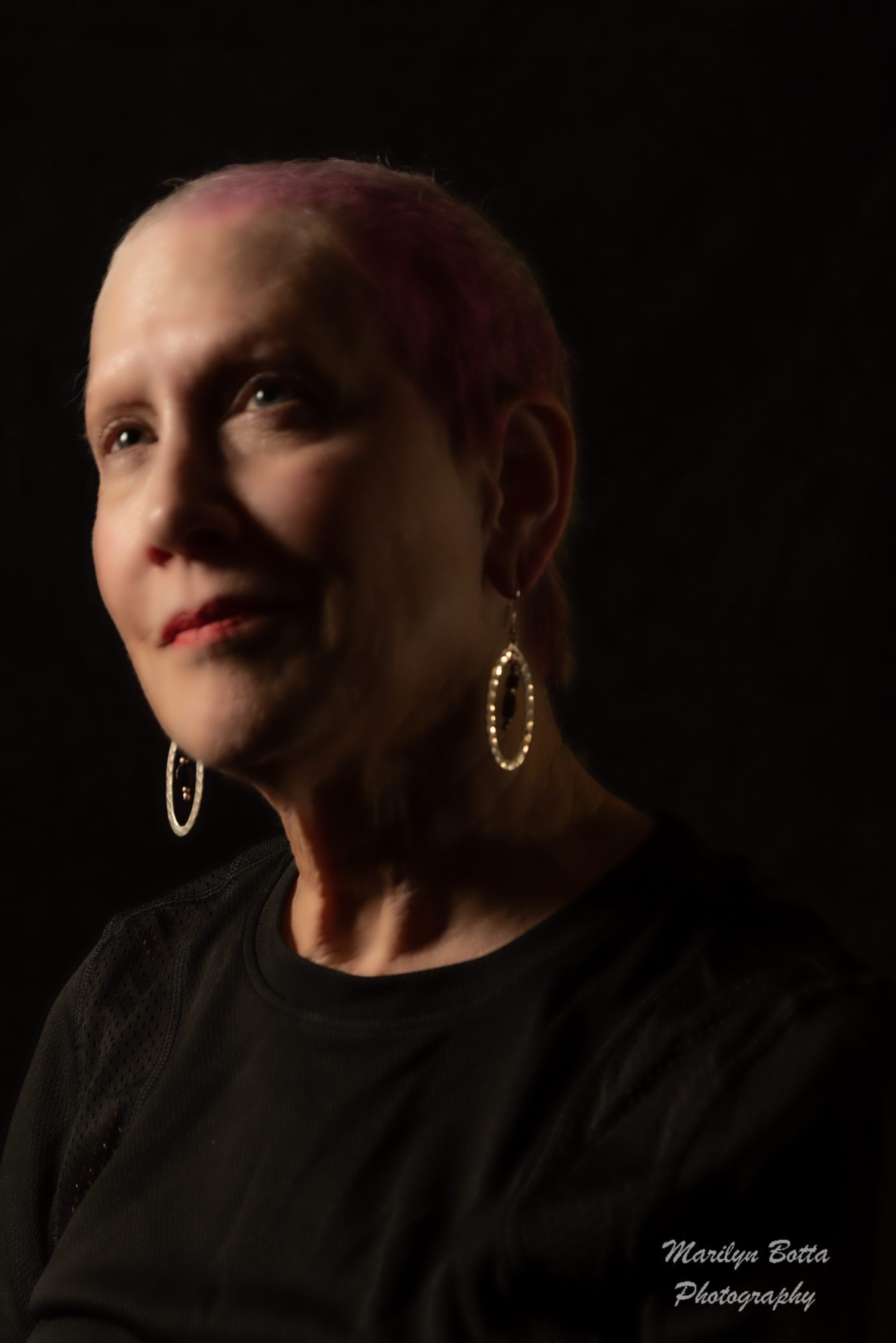 After losing my hair during 3.5 months of chemotherapy for breast cancer, I was pleased to finally see my hair coming back. It started on the sides and back of my head and I looked like a man with a fringe of hair around my head but it finally covered the back and top of my head. It will take a long time to grow it back to the long layered look that I had before chemo but it is on the way. At this point I will settle for a pixie look as long as the front can be combed into bangs. I know I must be patient but here are a few self portraits I took. The one with the flowers in the front with bare shoulders was taken naked with the flowers covering what I need to keep private. The black and white shots had no pink in my hair, but I added the pink in Lightroom.
