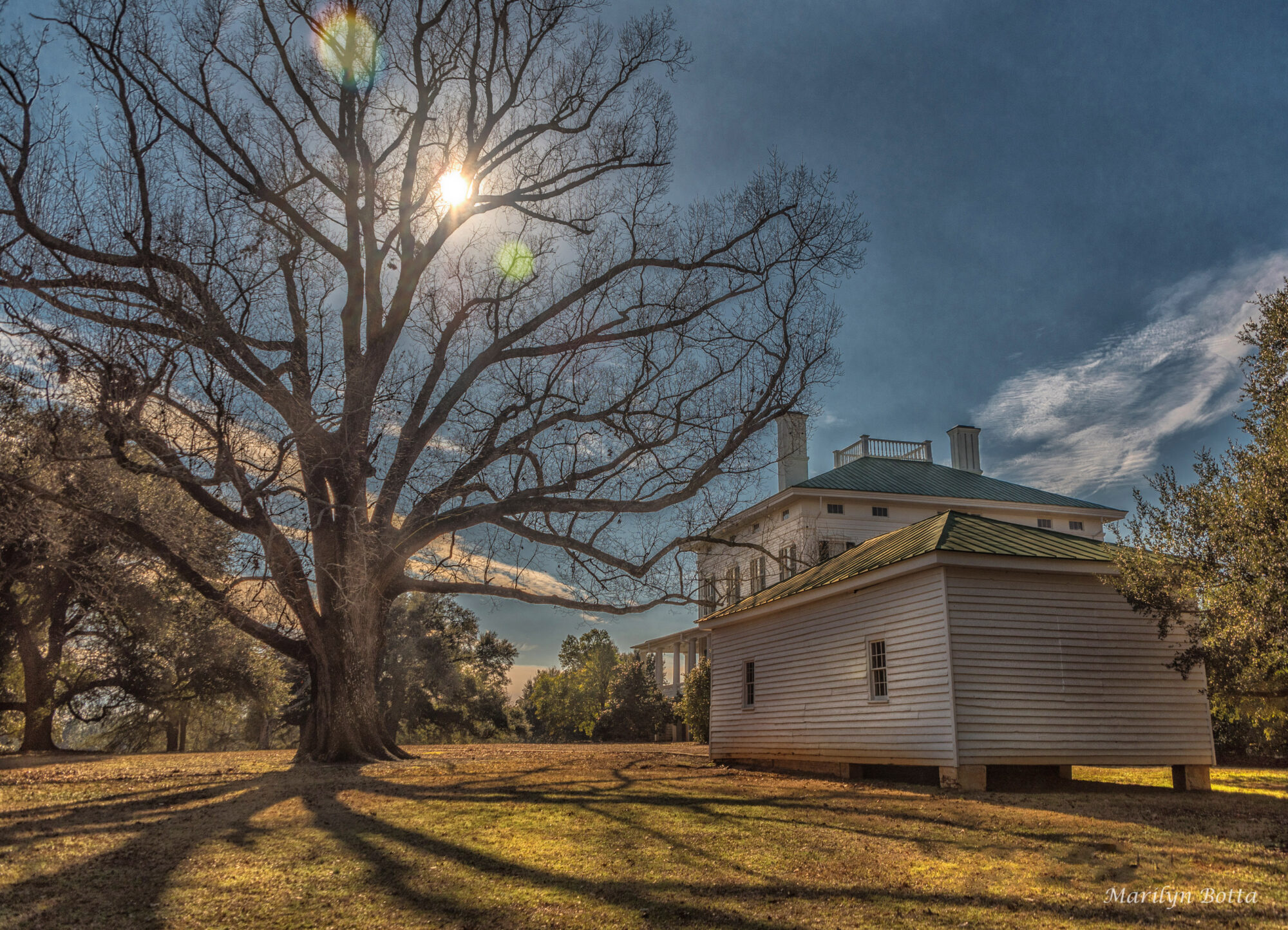 One late afternoon in January, my friend and I decided to take a trip to an old Southern plantation called Redcliffe Plantation located in Beech Island, S.C. It was a beautiful winter day in January. It is a very historic site, completed in 1859. It was once the home of James Henry Hammond and three generations of his descendants as well as numerous enslaved African-American families. Since it was winter this gorgeous oak tree was bare, but due to the lateness of the day, the sun was beginning to go down and the deep shadows of the branches extended across the grass. The white family mansion can be seen overlooking the enslaved quarters. This was a Southern plantation, after all, and there were slaves. Rays of sunlight filtered through the tree branches creating a magical look.