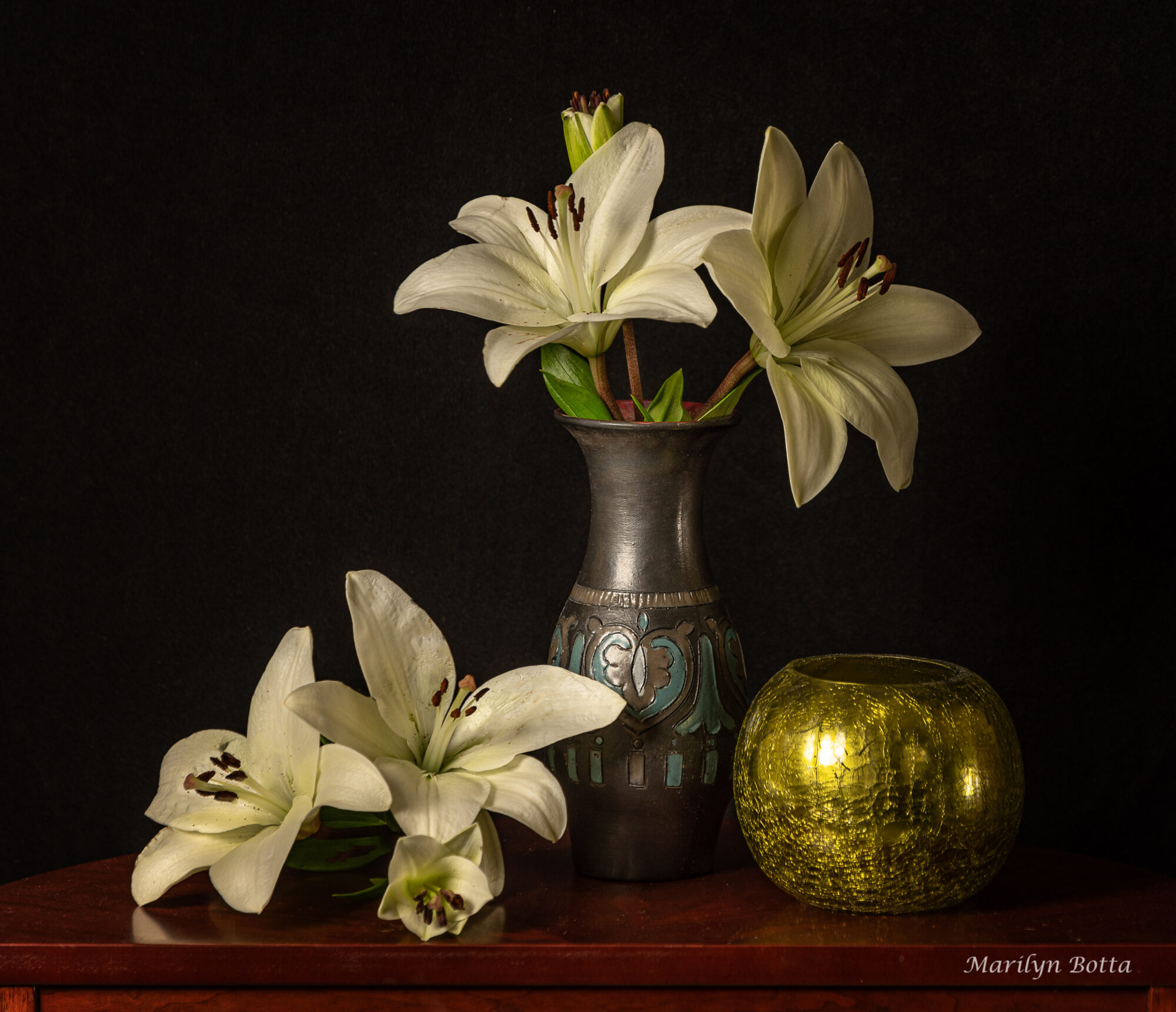 I just love white lilies against a black background. Here are three similar yet different images of white lilies. I hope you enjoy these pictures and love them as much as I do. I enjoyed taking these beautiful pictures.
