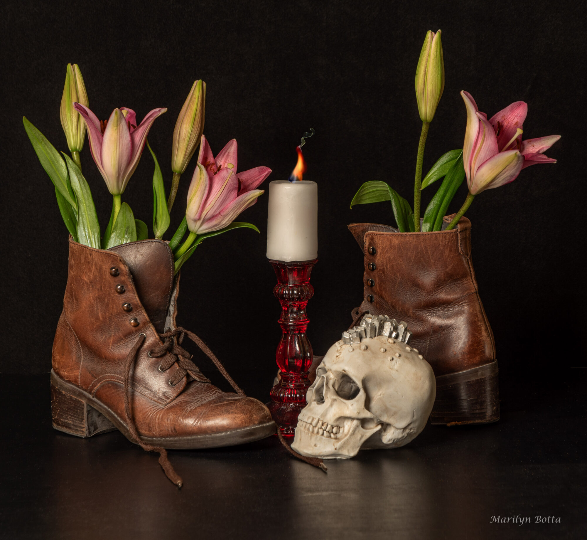 I had these old brown boots in my closet that I had not worn in a while. I wanted to use them in a photo, but decided to add a few items. Why not use the boots as vases? I absolutely love lilies, especially the gorgeous pink and purple ones, so I placed them into the boots. I felt the green stems and pink blooms would offset the brown in these boots. I decided to use a red candle holder and a skull. One would think that the elements I chose for this image would not work if taken by themselves. But together, the contrasting colors, shapes, and subjects form a pleasing, distinctive, yet unusual composition that somehow pleases me. For dramatic effect, I chose to photograph this creation in my studio against a black background.