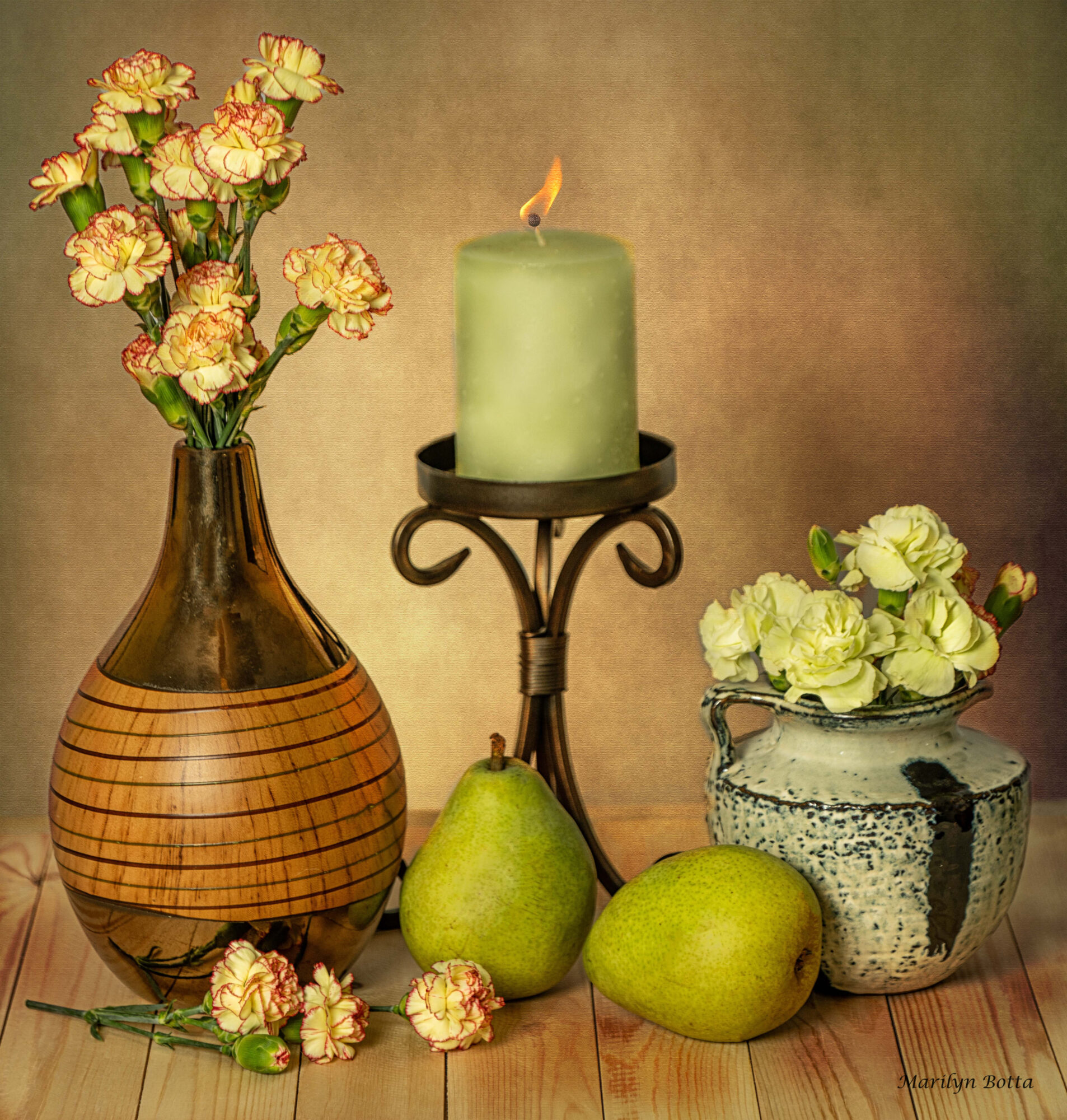 I decided to do a still life using mini carnations and green pears as the theme. I put the carnations into a pear-shaped brown glass vase. I also added the carnations to a small black-and-shite ceramic vase. I added a green lit candle to a metal holder and placed two green pears beneath it. I placed all the elements on top of a wooden board. I added an orange texture as a background to bring out the beauty of this composition which have complementary colors.