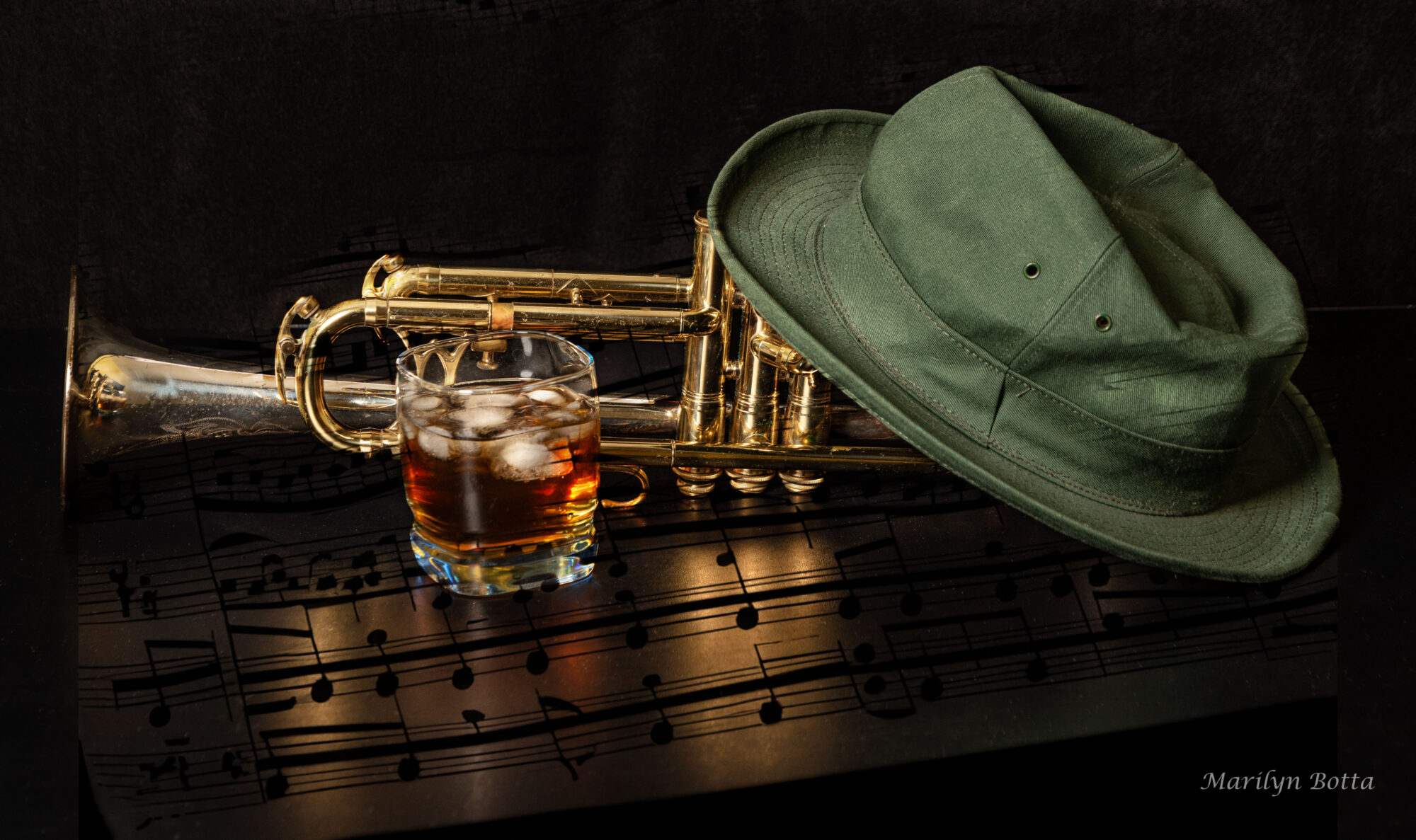 I just love the look of a trumpet–so shiny and sleek. In planning this composition I envisioned a lonely musician, having just taken his instrument out of the case, and fixing himself a hard drink to get him through the evening. I tried to elicit the jazz world with the contrasts of the gold of the trumpet, the black case, the ice in the drink, and black background. I feel by incorporating these elements, I have captured the mood of this scene.