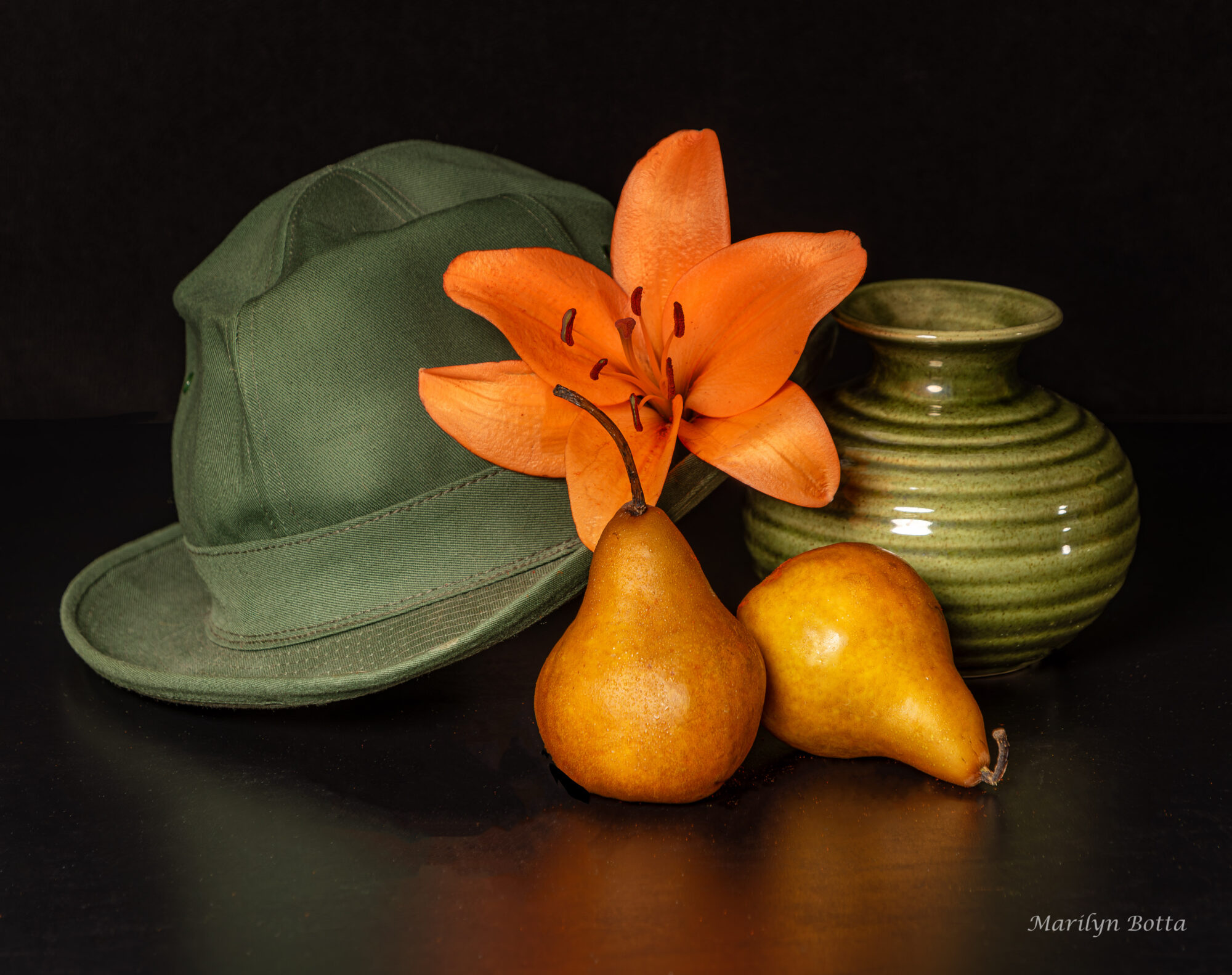 A vibrant yellow lily stands elegantly in a glass vase beside a martini glass holding a pear, with two more pears placed on a soft green cloth. The muted background enhances the natural colors and simple beauty of the arrangement.
