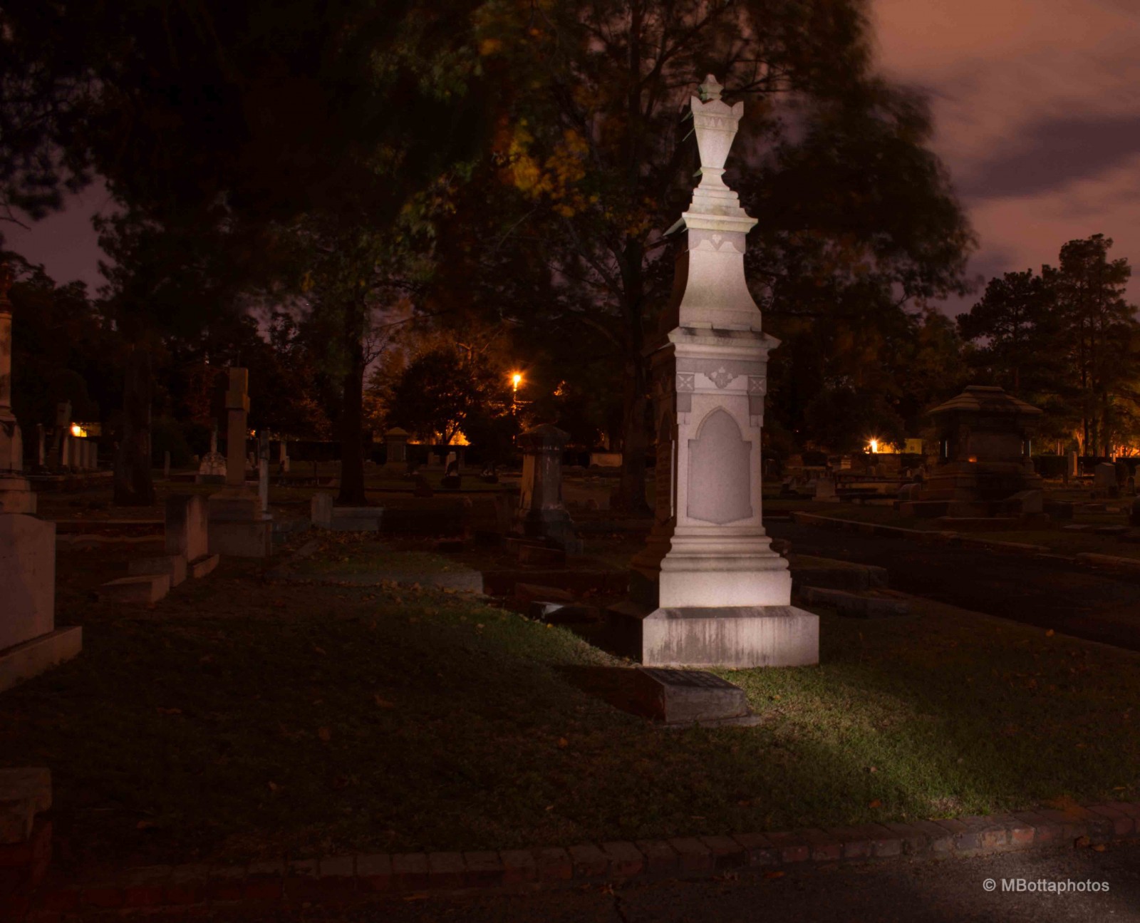Here are some spooky photos of the Summerville Cemetery in Augusta, GA. The photos were taken on Halloween night with camera mounted on a tripod, shutter speed 30, F-stop 5.6, with a long exposure and shutter release. While the lens was open for 30 seconds, we shined a flashlight on the subject up and down (painting with light). Here are the results–pretty cool.