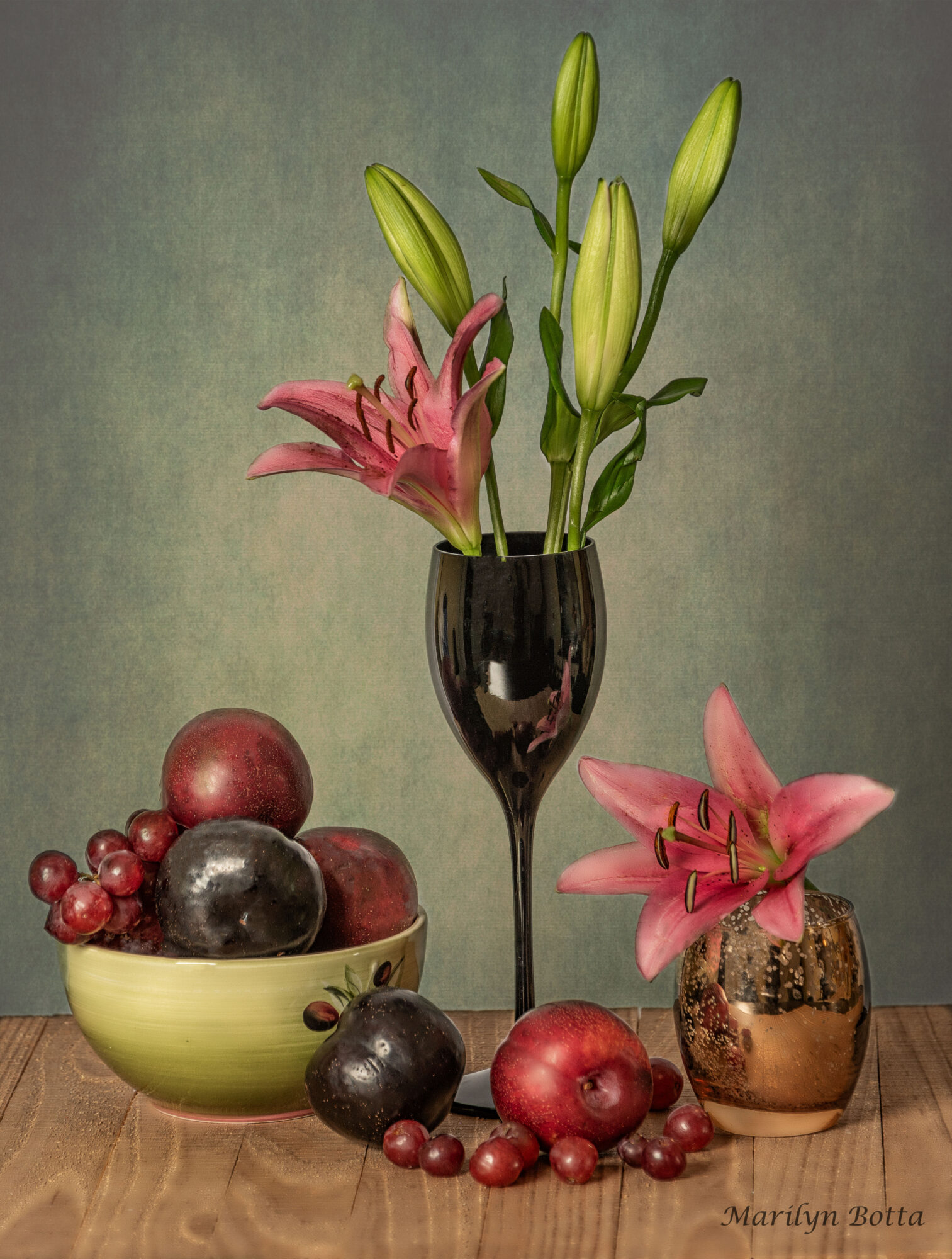 Filed Under: Still Life Photography, Uncategorized Tagged With: beautiful, black background, black goblet, black table, blue background, ceramic bowl, flowers, gold glass, grapes, green buds, lilies, pink, pink lilies, pretty, purple, purple plums, red glass vase, red grape, red grapes, red vase, reflective black surface, wooden board