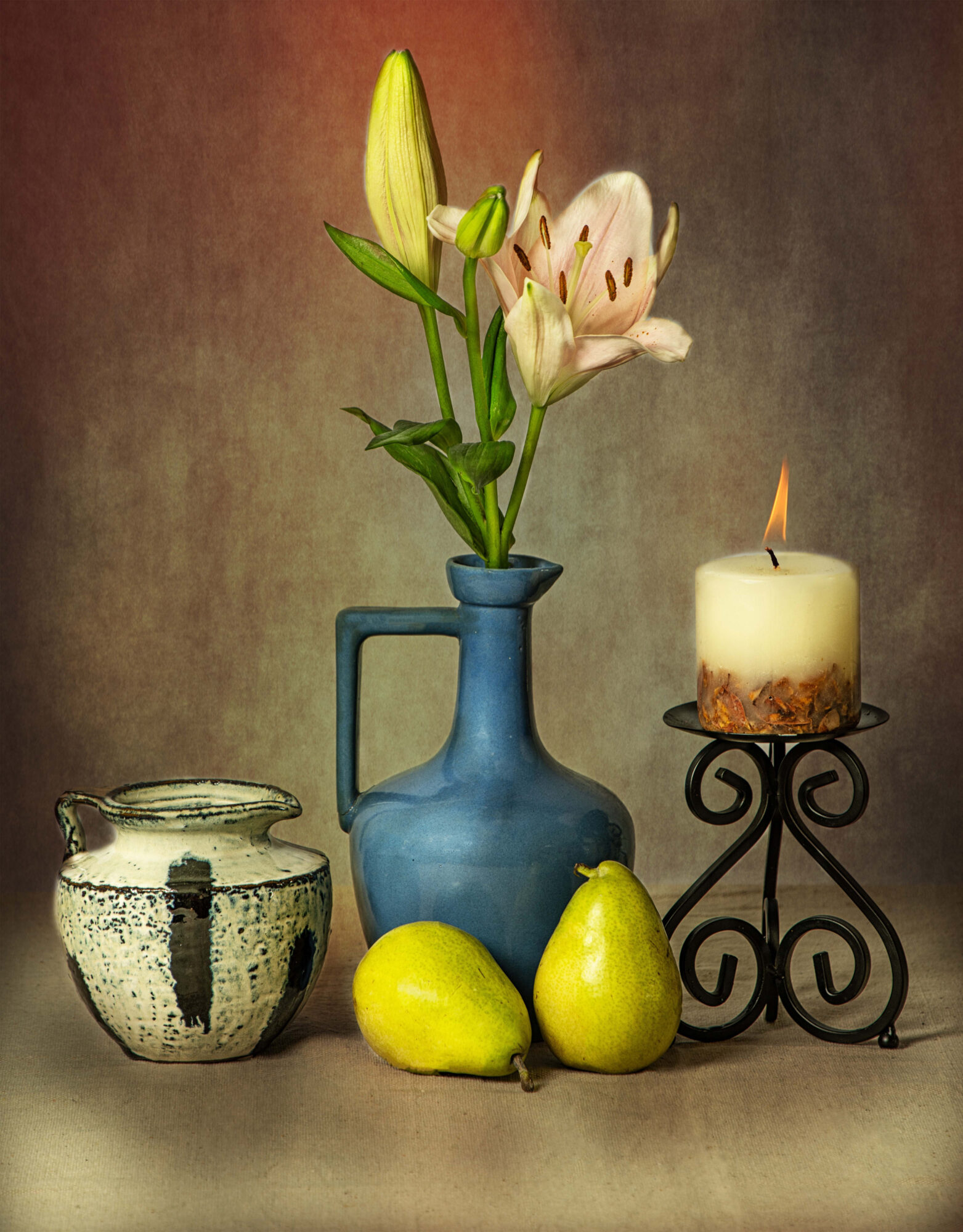 I have always loved lilies, the way the buds keep blooming for days. I decided to highlight pink lilies by placing them in a blue ceramic jug. To enhance the beauty of the flowers, I surrounded them with a brown and beige lit candle, and a white and black ceramic vase. I felt that this composition would be enhanced by two green pears. I placed the candle on a black iron ornate candle holder. My creation was photographed against a white background. I added a texture with an orange hue to enhance the beauty of this unique still life.
