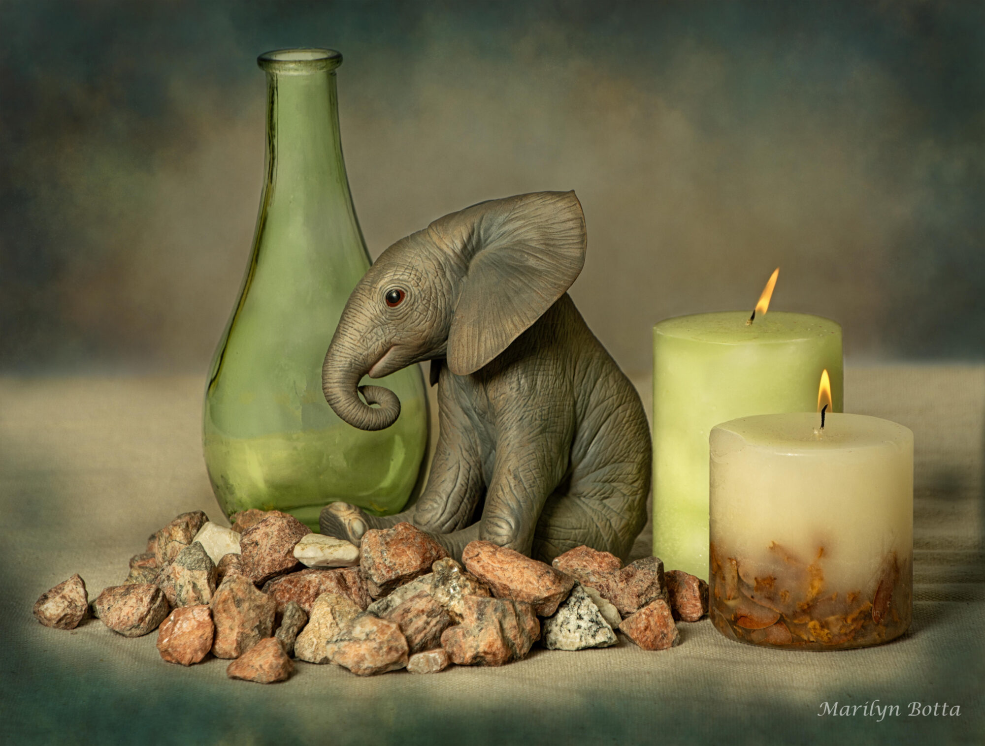 I was out looking for some inspiration for a still life when I came upon an adorable Lenox elephant. It was hard to believe that someone gave this away to Goodwill. But their loss was my find. I bought it because I thought it was just so cute and beautiful, not really knowing what in the world I was going to create. I had some old stones that I collected a while back sitting in a plastic bag. I thought that at some point I would think of something to do with them. I had a brainstorm and this is what I came up with. I used a texture to bring out the beauty and soft lighting of this lovely cozy scene.