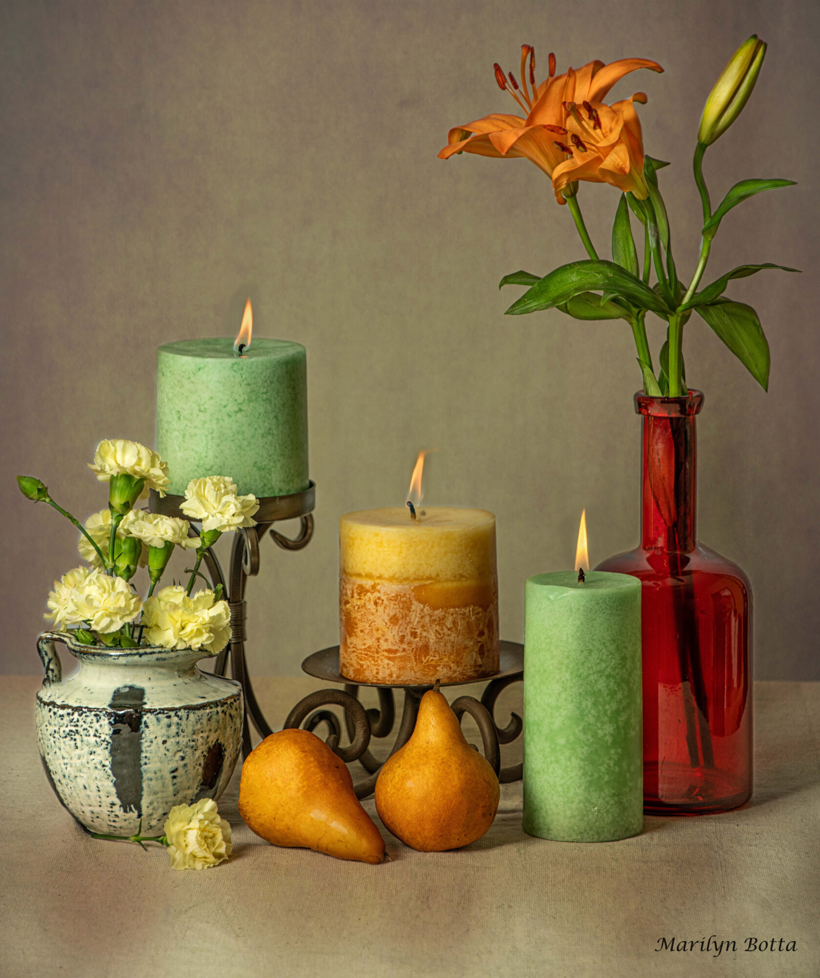 I did a number of similar still life images–similar but different. They all utilize the candles of green and orange, but the vases are different. I used the tall blue vase in some and the red vase in others. Although the theme is similar, they stand on their own as a separate piece of art.