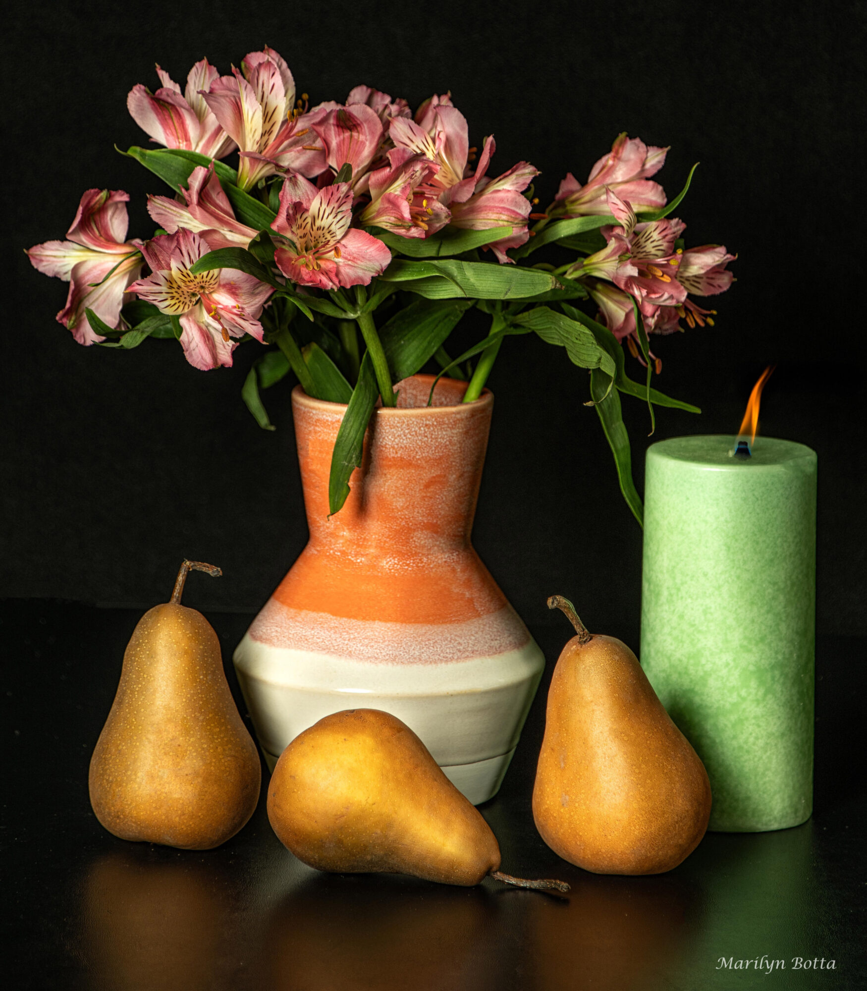 I always love a still life photographed against a black backdrop. I find the stark contrast between the bright, beautiful elements of the pink flowers, green candle, brown Bosc pears, and orange ceramic vase creates a gorgeous and amazing composition. The black table creates the lovely reflections which add to the overall beauty of this image.