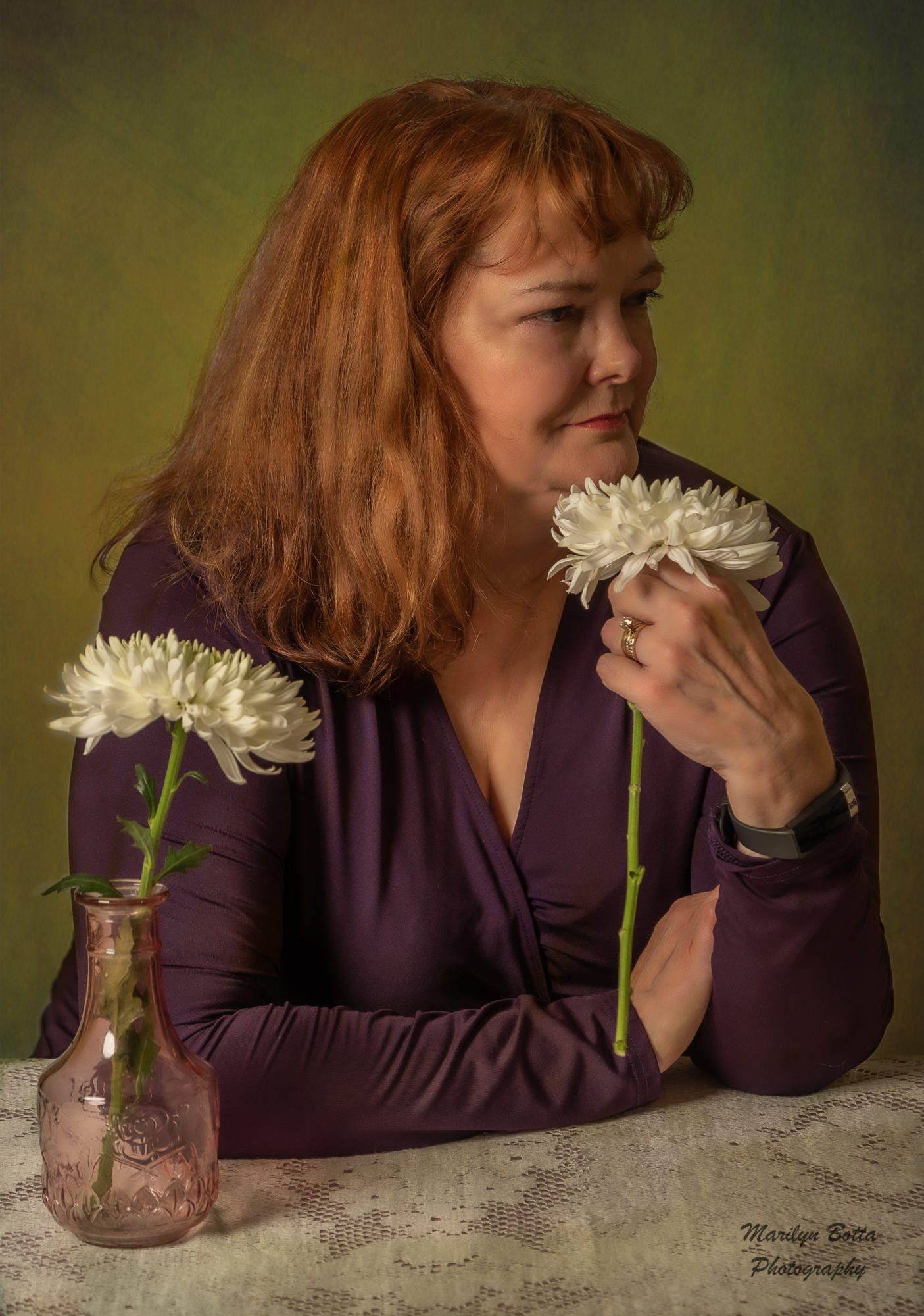 I did a photo shoot of my friend, Susan. She came with all kinds of different props such as a flowered wreath for her hair. I supplied the large hat. It was a fun day. I had some beautiful chrysanthemums that added some beauty to the shoot. She also brought her camera which I photographed in low key. All other pictures were shot against a white backdrop and I added textures in Photoshop post processing.