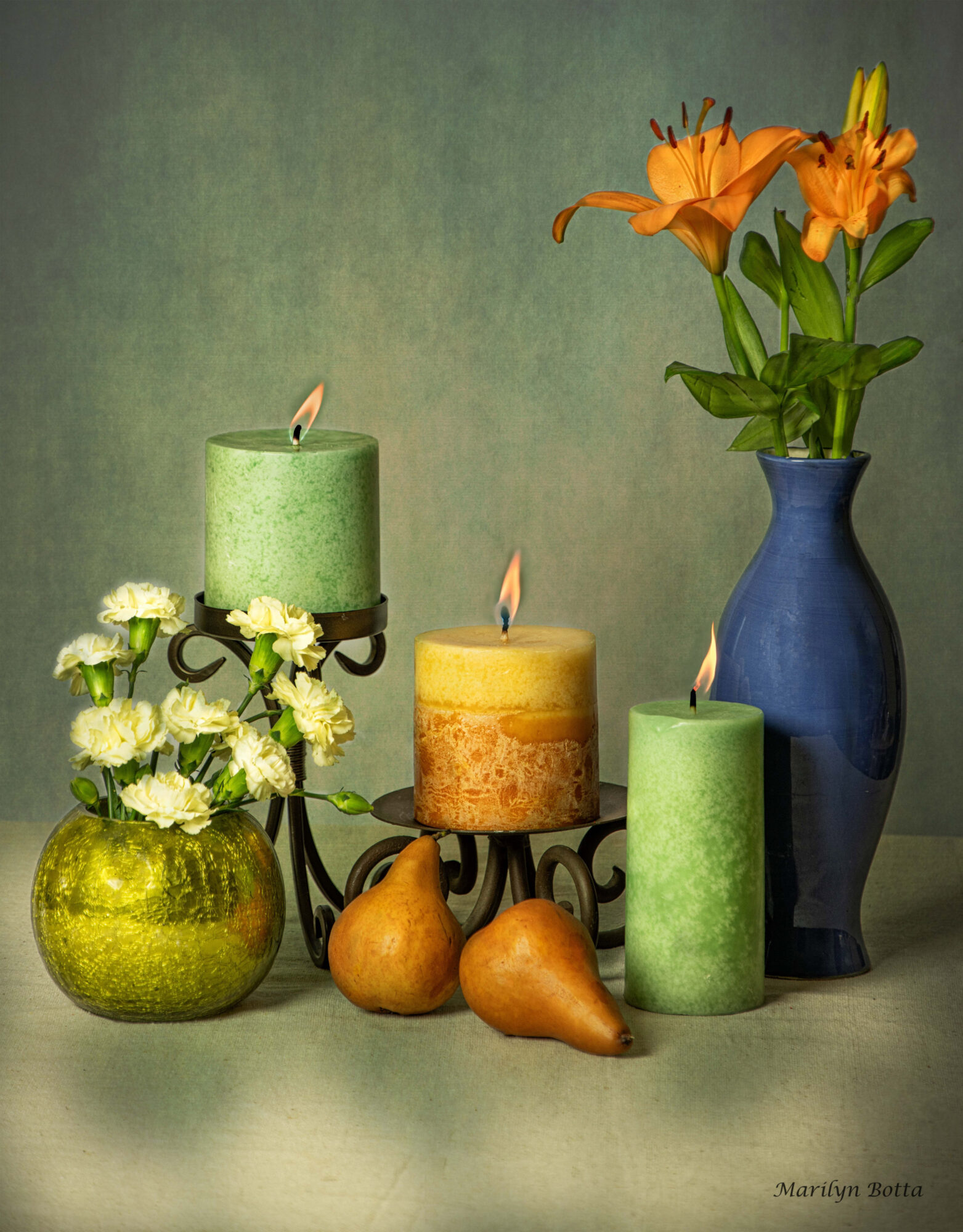 I did a number of similar still life images–similar but different. They all utilize the candles of green and orange, but the vases are different. I used the tall blue vase in some and the red vase in others. Although the theme is similar, they stand on their own as a separate piece of art.