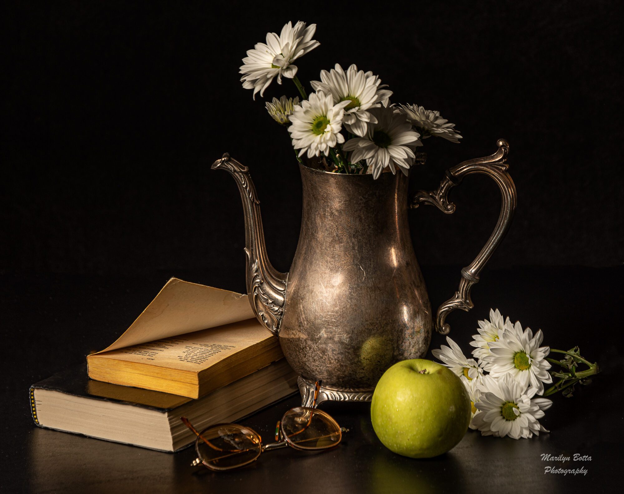 I was out doing my walking last week when I came upon a hubcap, in good condition. I decided it might make an interesting picture. I tried to use travel as a loose theme, so I added an old New Jersey license plate, yellow sunglasses, and a wrench. In keeping with the colors of the flowers, I included a green apple. I added a candle and metallic candle holder to complete the image. I felt that a black backdrop would enhance the scene.