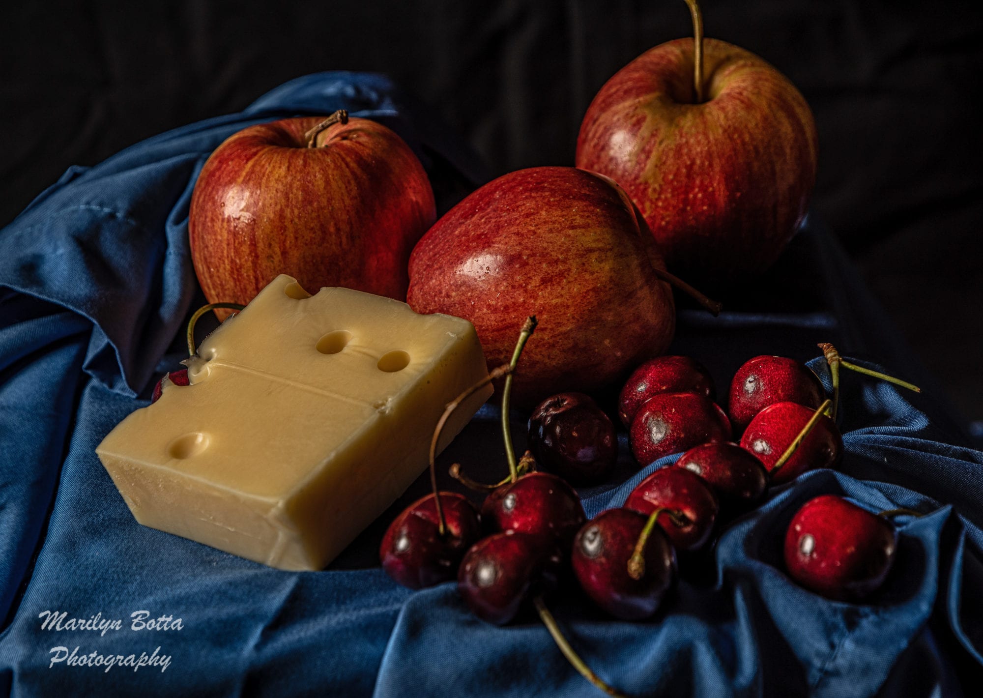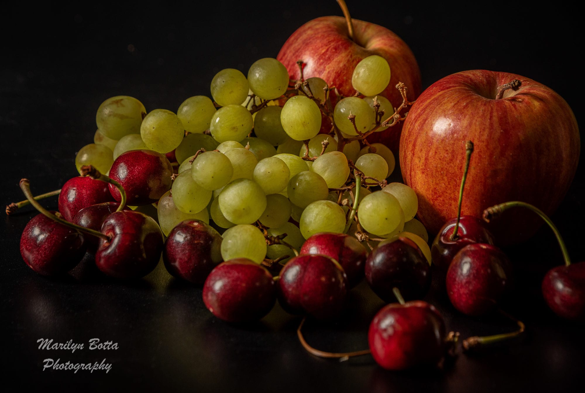 I decided to do a still life with the color theme green and brown. I like those earthy colors because they blend so well together. I already had a small, green ceramic vase, and rather than my usual red grapes, I felt that green grapes would be in keeping with my theme. I bought some yellow chrysanthemums to offset the green and brown tones. Once I had the specific composition mapped out, I assembled my vision on a shiny brown reflective desk. The brown pears, green grapes and all the elements came together. For a dramatic flair, I photographed the scene against a black background.
