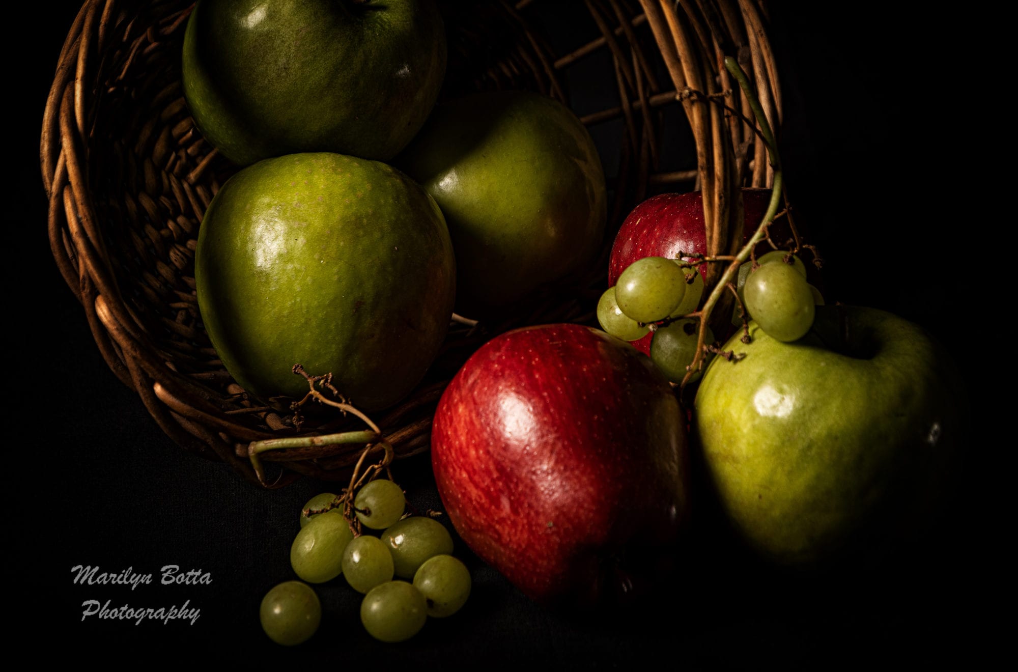 Apples in studio. Green and red apples on basket tumbling down. I added a green texture to the green apples.