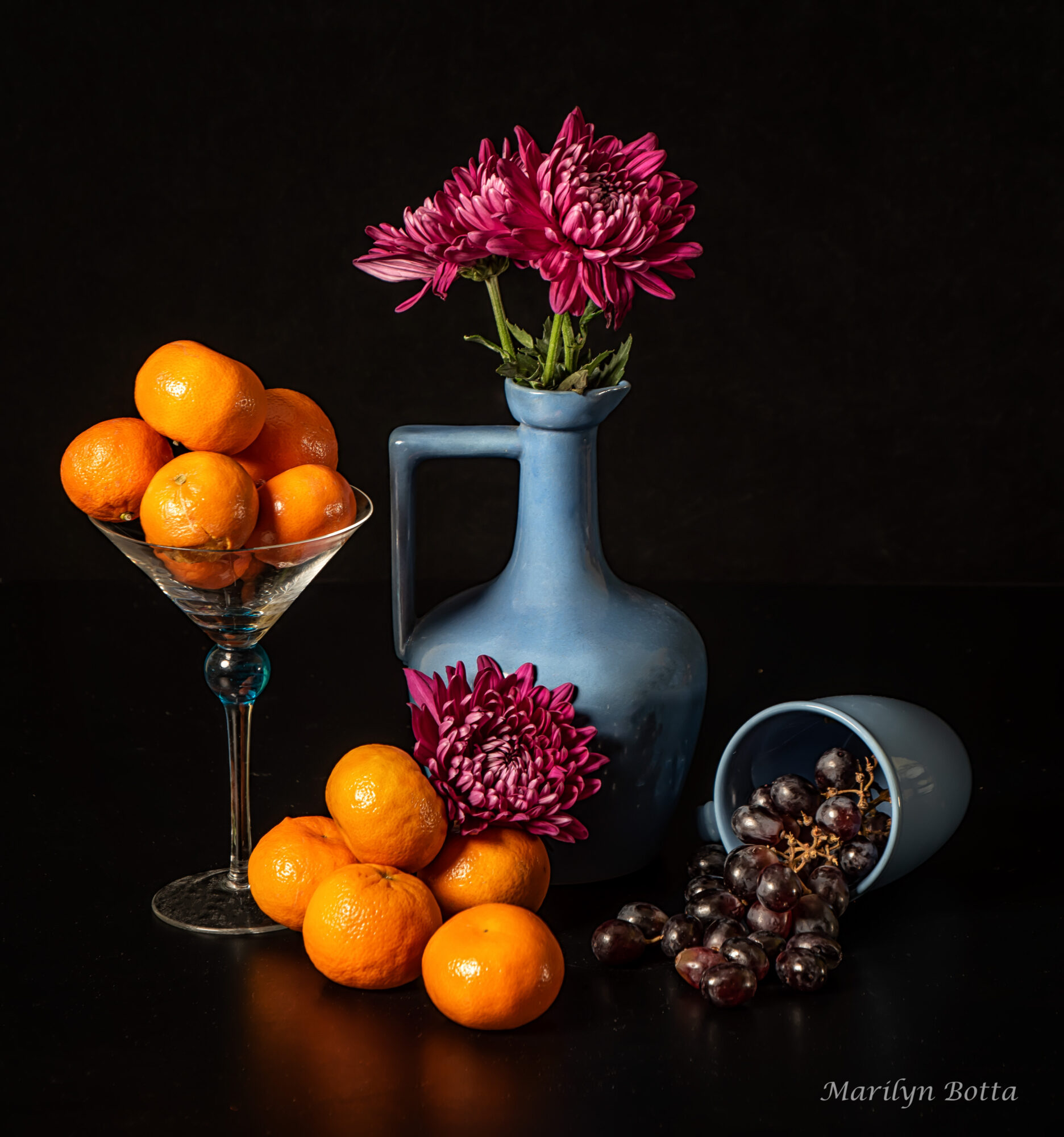 I recently purchased a pretty blue vase at Goodwill. Someone discarded it but I picked it up and decided to use it for some studio still life photos with beautiful flowers. Someone else’s trash can become someone’s treasure. Here are four images using the blue vase, some similar, yet different. I decided to use lemons and yellow lilies in a wicker basket, some I used purple poms and oranges, in a glass beaker, as well as grapes. I used black backgrounds on some and one I added a texture.