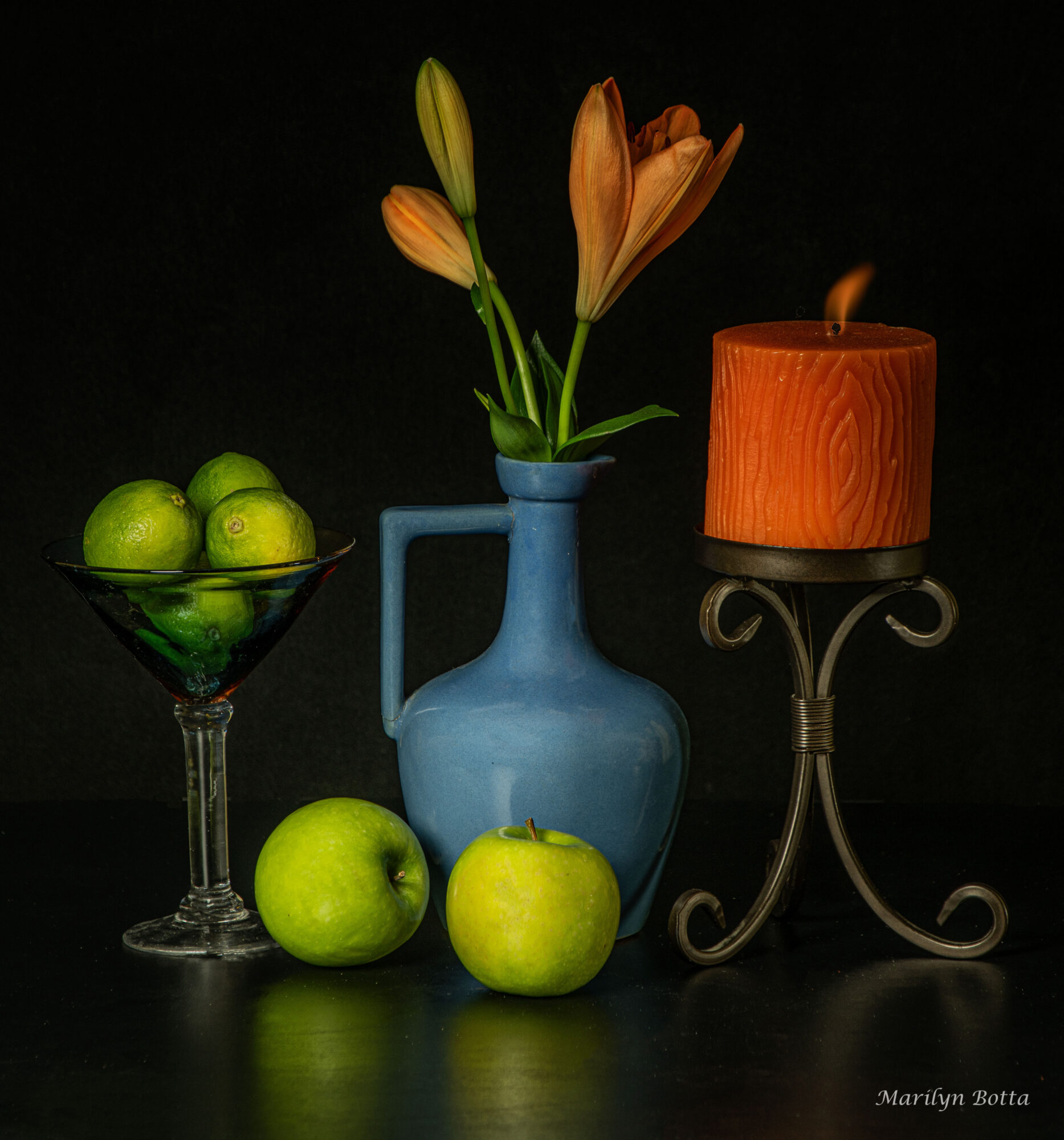 This still life creation features a blue vase with orange lilies. Green apples sit at the base of the blue jug. I had a martini glass and added four limes to match the apples. I added a thick orange candle placed on a pewter candle holder. The orange in the candle offsets the orange in the lilies. I placed green apples at the base of the jug. The composition is set against a muted background, highlighting the vibrant colors of the objects.