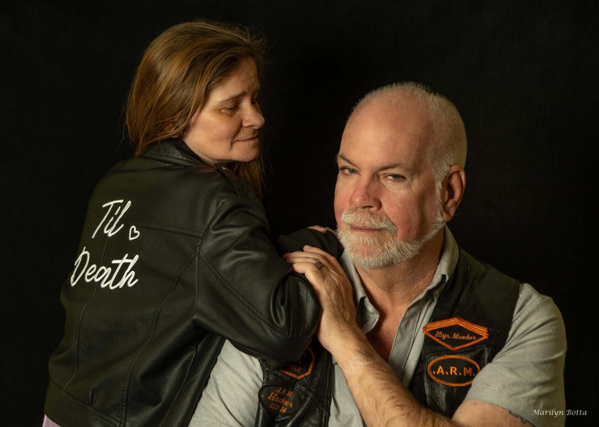 Gerry and Dawn recently got married but didn’t have any really nice portraits of the two of them. I offered to take some studio portraits of them in their wedding outfits. The couple are a bit unconventional in that Gerry wore a gray shirt and black motorcycle vest and Dawn wore a lavender gown. I took many photos of Gerry and Dawn in various poses, most of which show their love for each other. Here are the best images taken. They were very cooperative and it was a fun day.