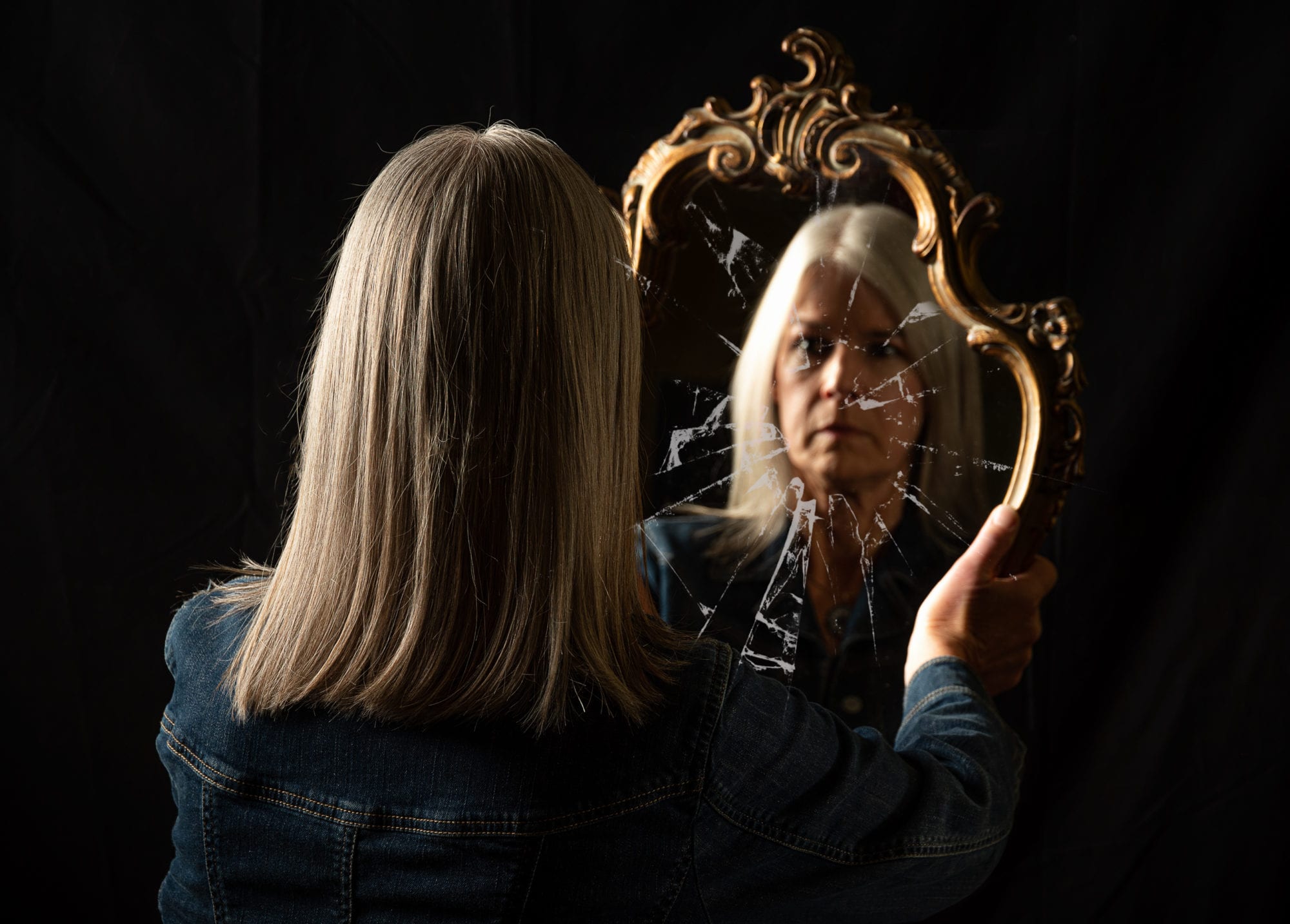 I had an assignment for Chicks that Click photo group to come up with an image representing Identity Crisis. I enlisted my friend Joyce who is a wonderful model and had her pose gazing into a mirror. I did this in my studio upstairs and put the soft box with my AD200 strobe light on the left side with a grid over the box. This was done to achieve a low key effect. In editing I added both a blue texture to the mirror and then I added a shattered glass brush over it.