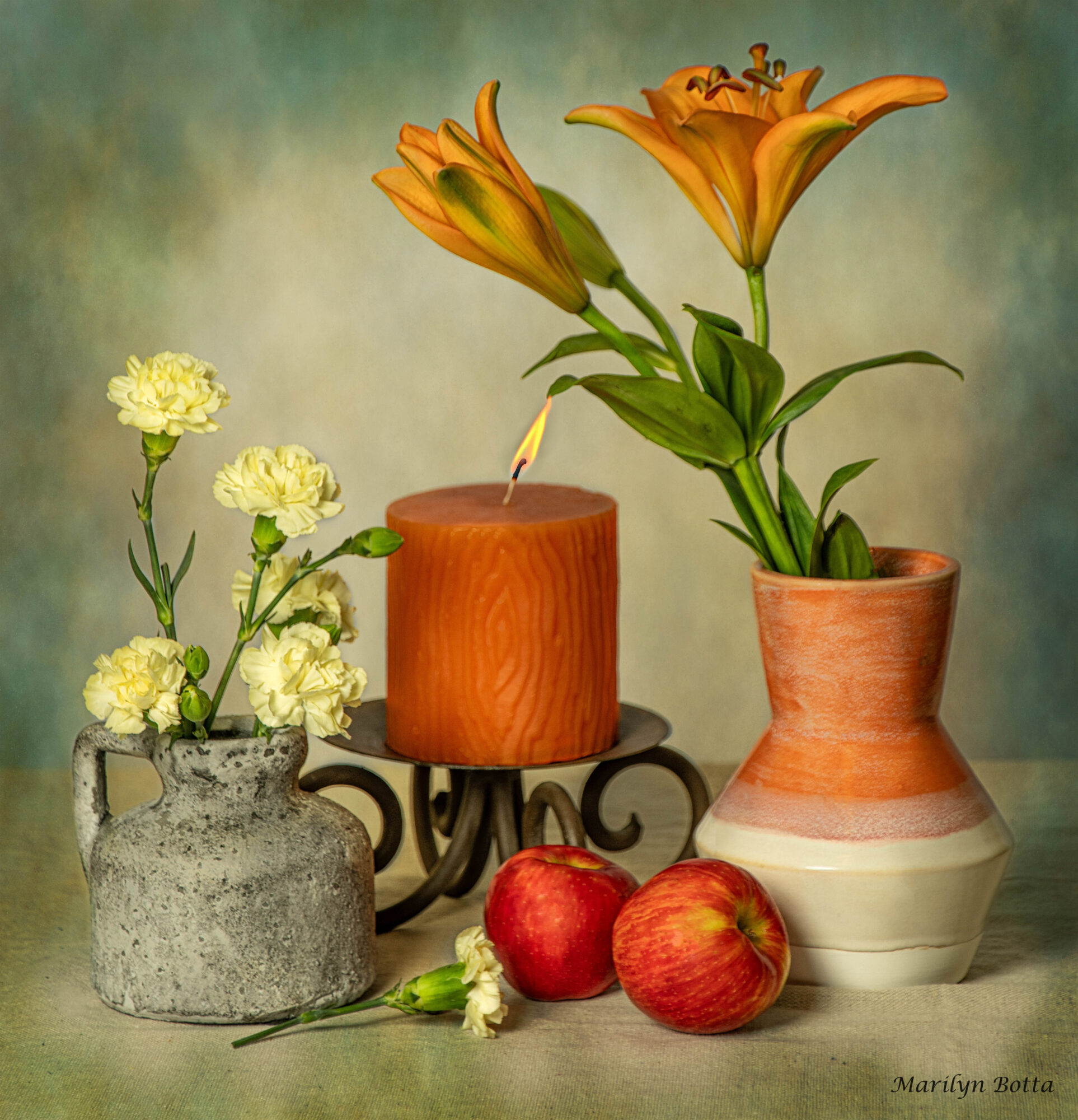 I found an orange wax candle, and a peach and cream colored ceramic vase while looking for items to use in my still life. The vase was matched with some gorgeous orange lilies which offset the orange in the candle. Two red apples were placed at the base of the candle holder, and added a gray stone vase with little baby yellow carnations was added. The entire composition was offset by a beautiful texture I added as a background. There is a lovely contrast between the rustic vases and the vibrant colors of the flowers.