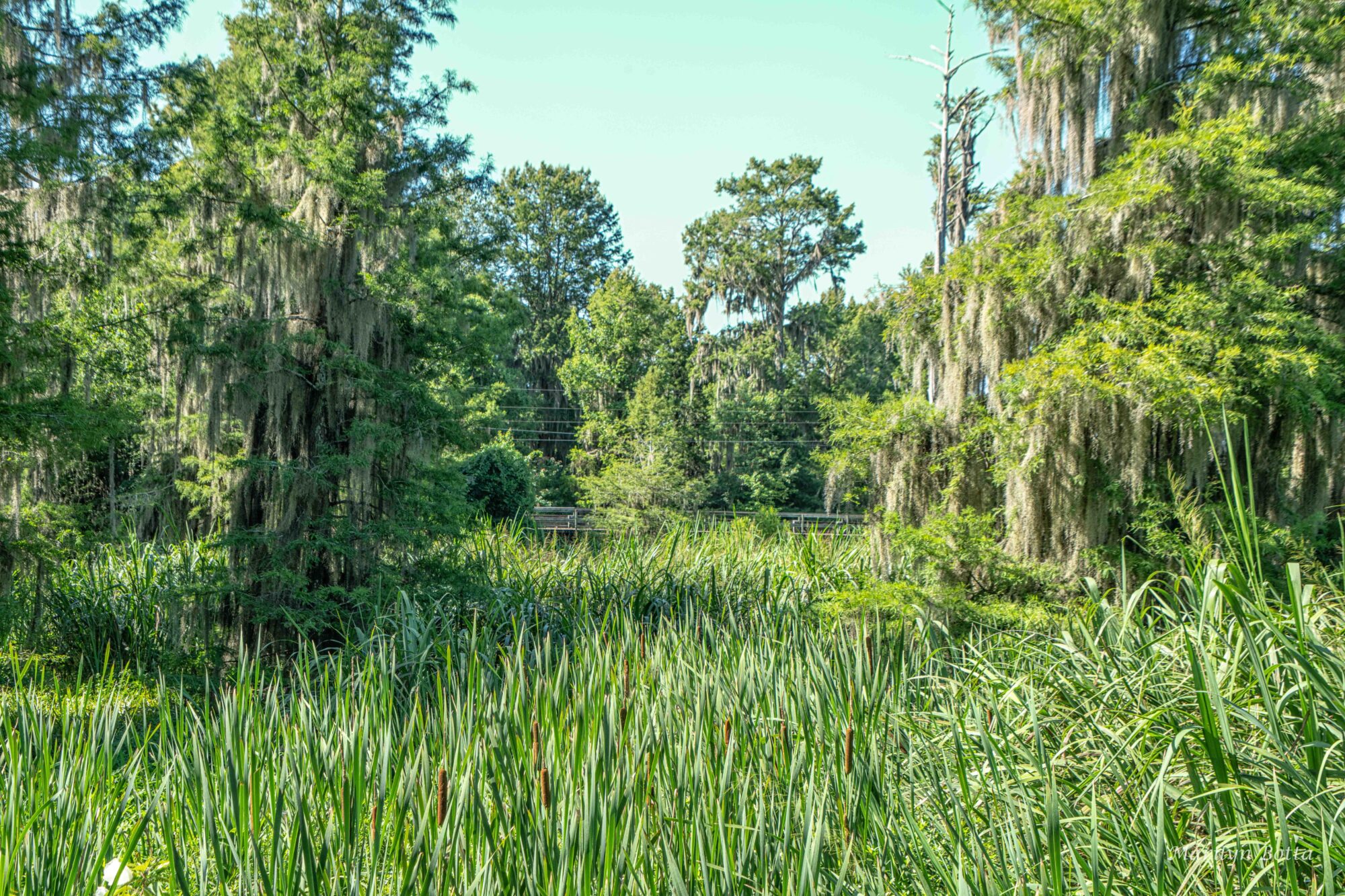 I visited Phinizy Swamp in Augusta, GA, last week. It is a beautiful nature preserve and wetlands. Although it is very lush in the Summer, I still managed to find some gorgeous scenery. It is so peaceful and tranquil along the footbridge, where Spanish moss and lush green trees grow on either side of the bridge. The blue sky was a lovely contrast to the green foliage. The sunlight casts a pattern of shadows on the pathway, enhancing the natural serenity of the scene.