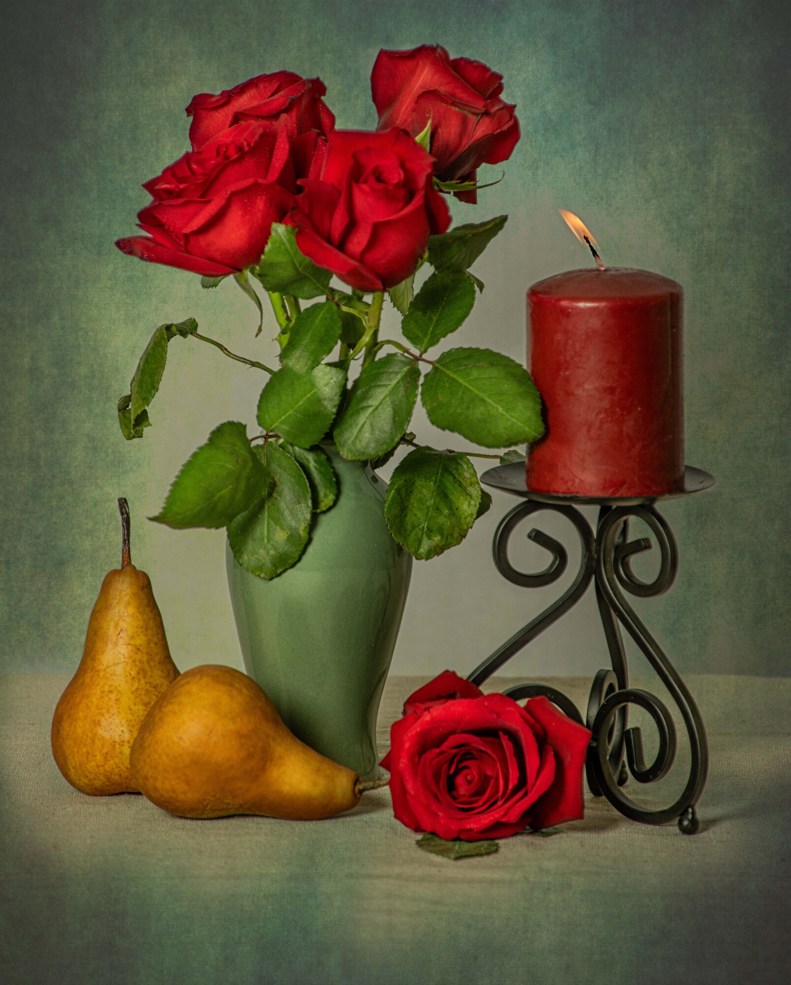 Roses come in many different colors, but to me, the red rose is the most beautiful. I love the way the delicate fragrant soft petals are enfolded so perfectly. I decided to use these beauties in a still life along with some pretty brown pears. I placed the roses into a green ceramic vase to offset the red in the roses. I placed a red lit candle on top of a wrought-iron holder and added a single red rose at the bottom. I arranged the pears at the foot of the vase. The entire composition was situated on a beige table cloth. I then selected purple and blue textures for the background to enhance the vivid colors of the elements of this creation.