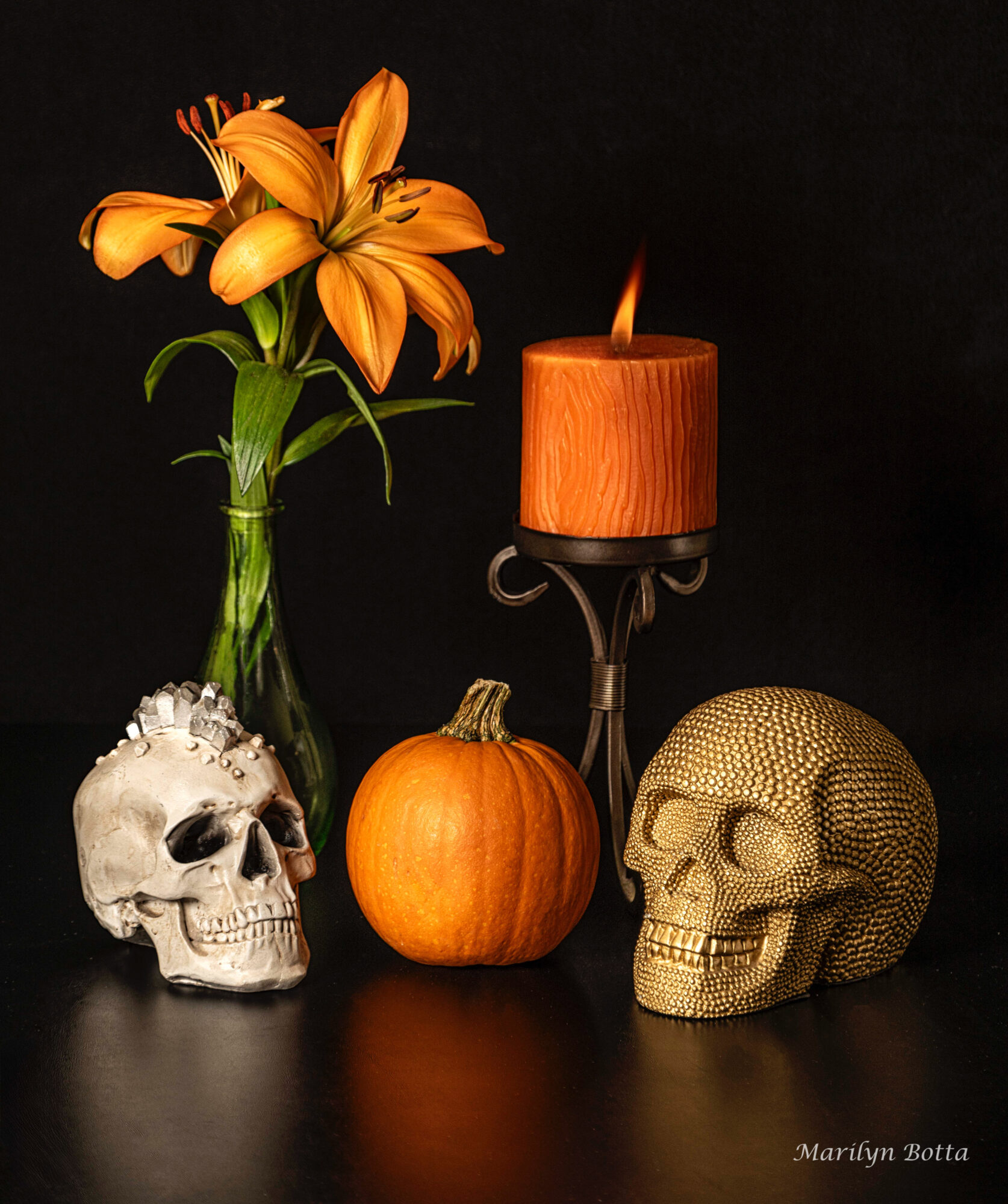 I decided to create an image depicting the beautiful autumn colors of Halloween. I also decided to add some spookiness to this gorgeous scene by using some skulls. Nothing says Halloween like scary skulls. Of course I had to include a lovely little orange pumpkin. Orange lilies, and a thick orange lit candle all captured against a black backdrop depict the magic of Halloween.