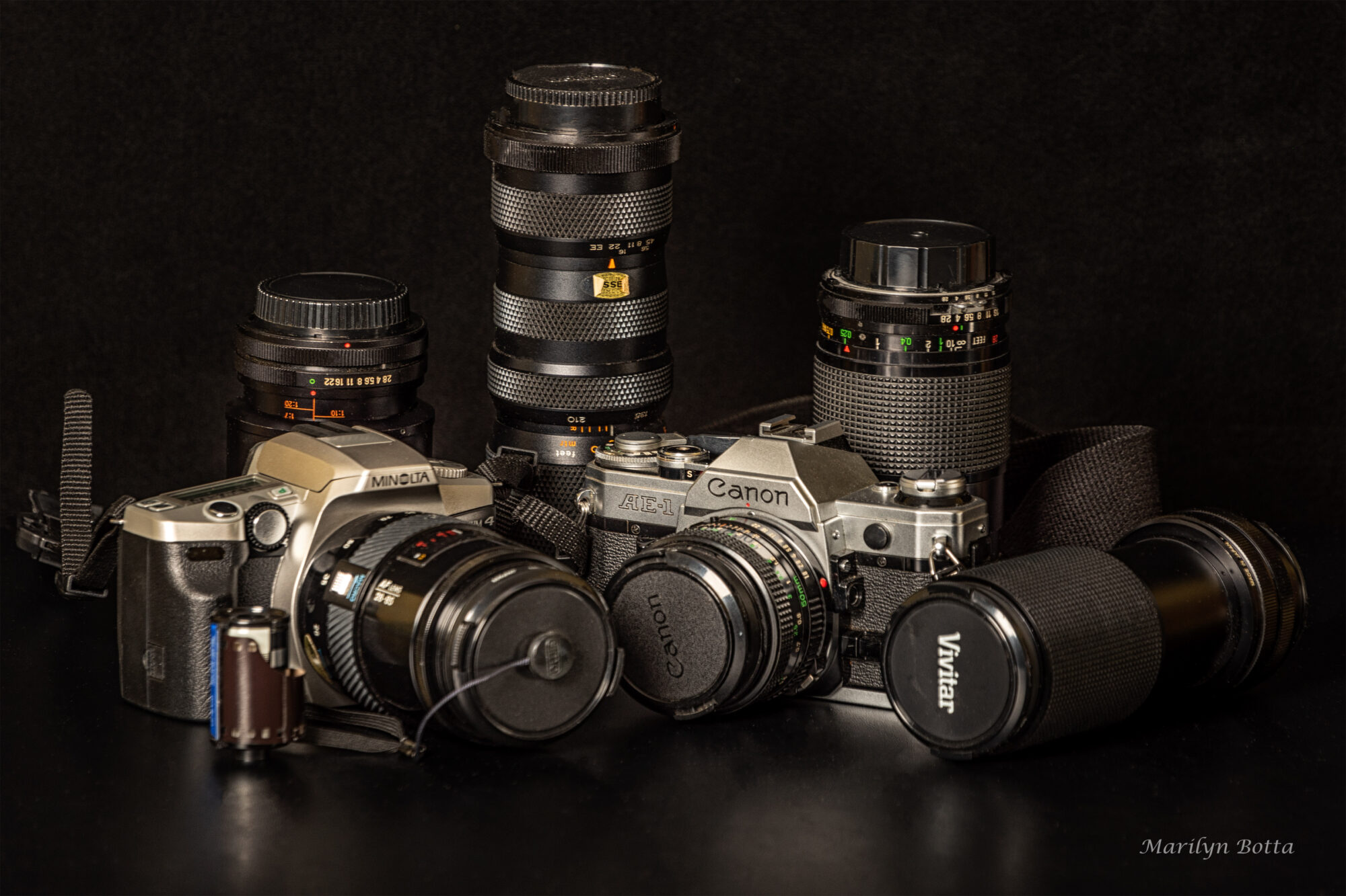 I always wished I had not sold my old Nikon FM 2 film camera. At the time it was considered one of the fastest SLRs. When I upgraded to digital, I decided I didn’t need it anymore. But when I started doing still life photography, I thought that my antique camera would make a good subject. But, recently a friend had some old camera equipment used by his father packed away in a closet. He was doing housecleaning and came upon a box of two cameras–a Canon and a Minolta, plus numerous lenses. He asked if I wanted it and I said yes because I simply wanted to photograph these treasures.
