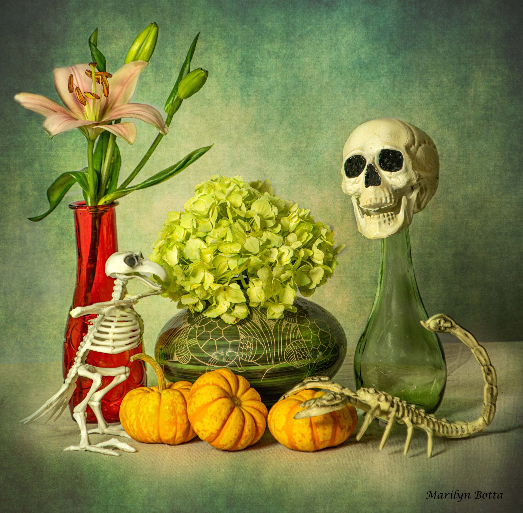 I thought it only fitting that I do a Halloween themed image. I decided to photograph this scene agains a black backdrop to give it a spooky and eerie quality. I always seem to get some flowers into many of my creations. These pink lilies add a pretty pop of color, as does the bright orange candle. The brown pewter candle holder enhances the color of the beautiful textured candle. I placed a small skull atop a green glass vase. A scorpion and mini pumpkins complete my the eerie atmosphere and my vision.