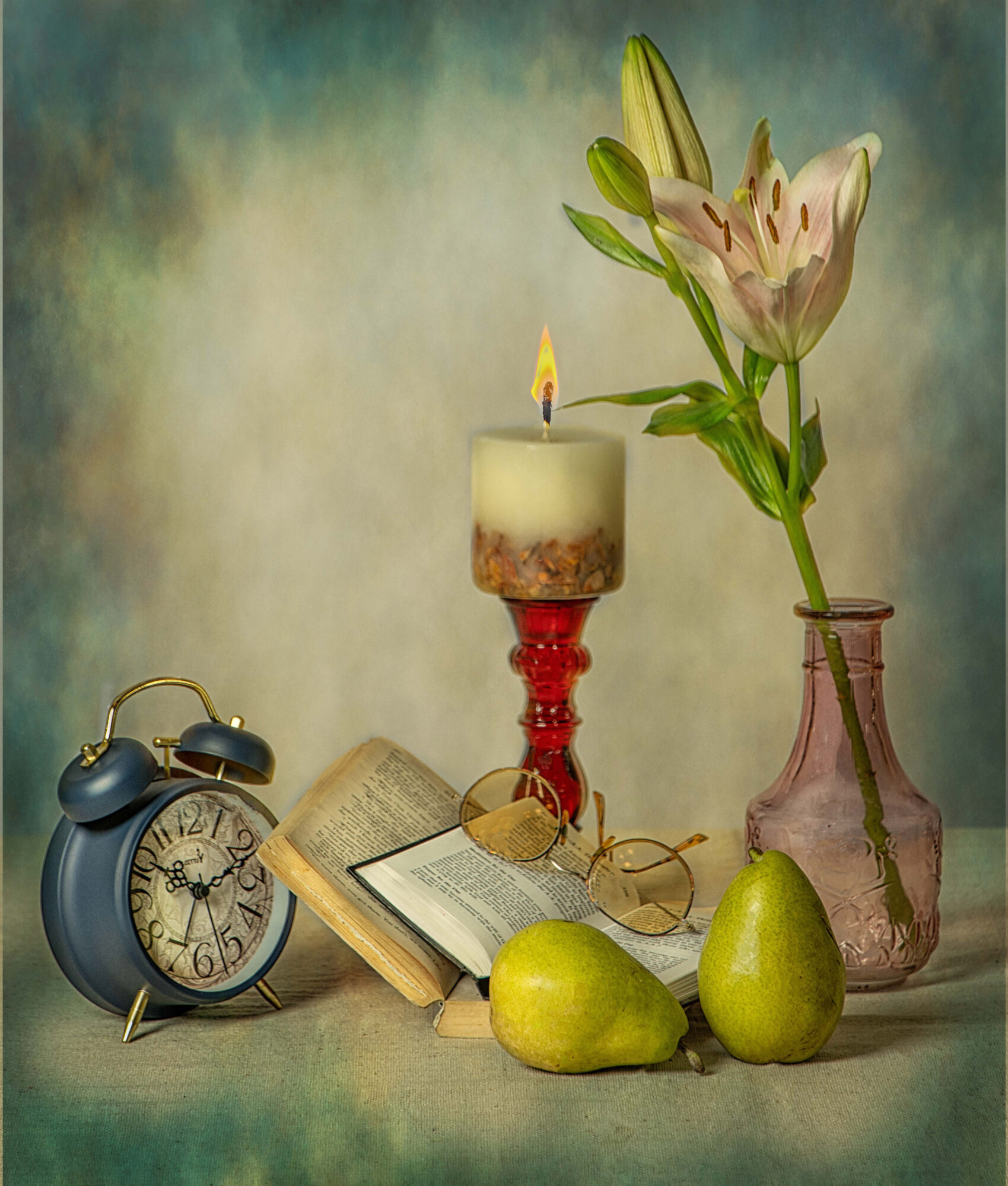 I enjoy combining many seemingly unrelated objects into a cohesive composition and telling a story too. The theme is reading by candlelight so, in addition to the candle and books, I added a red candle holder, an alarm clock, and pears. I felt that his creation needed some lovely pink lilies to bring it together. The pink glass vase matched the pink lilies. This arrangement has a classic, still-life feel with a soft, blurred textured background.