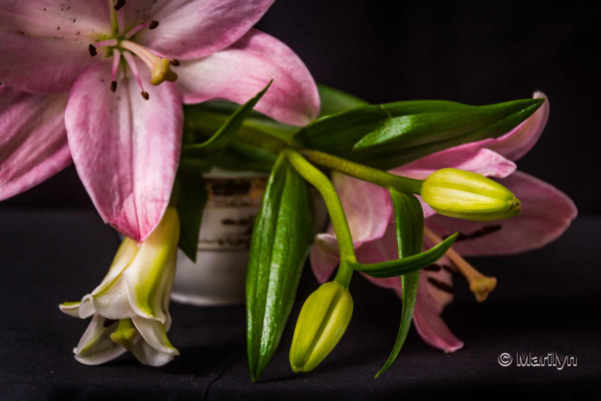 I have always loved lilies, the way the buds keep blooming for days. I decided to highlight pink lilies by placing them in a blue ceramic jug. To enhance the beauty of the flowers, I surrounded them with a brown and beige lit candle, and a white and black ceramic vase. I felt that this composition would be enhanced by two green pears. I placed the candle on a black iron ornate candle holder. My creation was photographed against a white background. I added a texture with an orange hue to enhance the beauty of this unique still life.