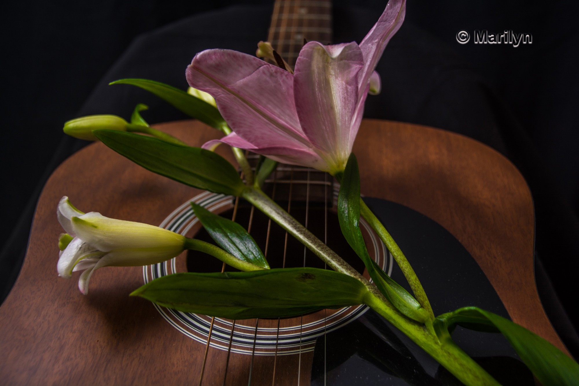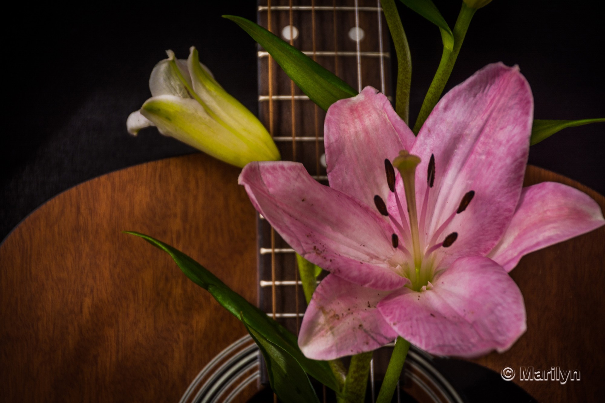 I found my guitar in the closet, in the back, and felt so sad that I abandoned it years ago. Life became life and I got involved with other endeavors, such as photography. But I found another use for my poor, lonely, guitar–namely putting pink lilies on the strings and, voila, it has been brought to life again. Here are my flowers and guitar photos.