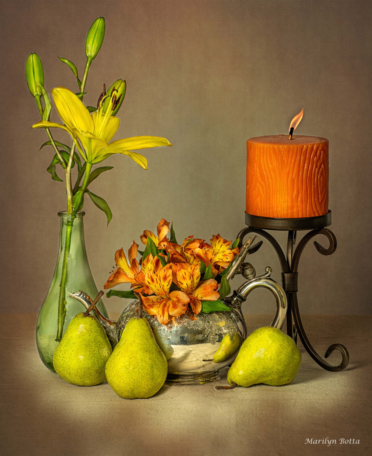 I had an old silver teapot on my credenza, just gathering dust. I bought it years ago in Charleston thinking it might be worth something. I still don’t know about that, but it was pretty. Before using it in my image, I first had to polish it. I always wanted to use it in a still life, but didn’t know what to do with it. Finally, I decided to add some Peruvian Lilies to the opening. I love the look of pears so I added them as well. I added a lovely ornate candle holder with an orange and yellow thick candle to offset the orange in the flowers. The background is a texture I added in. i think the darkish background brings out the beauty and drama of this arrangement.