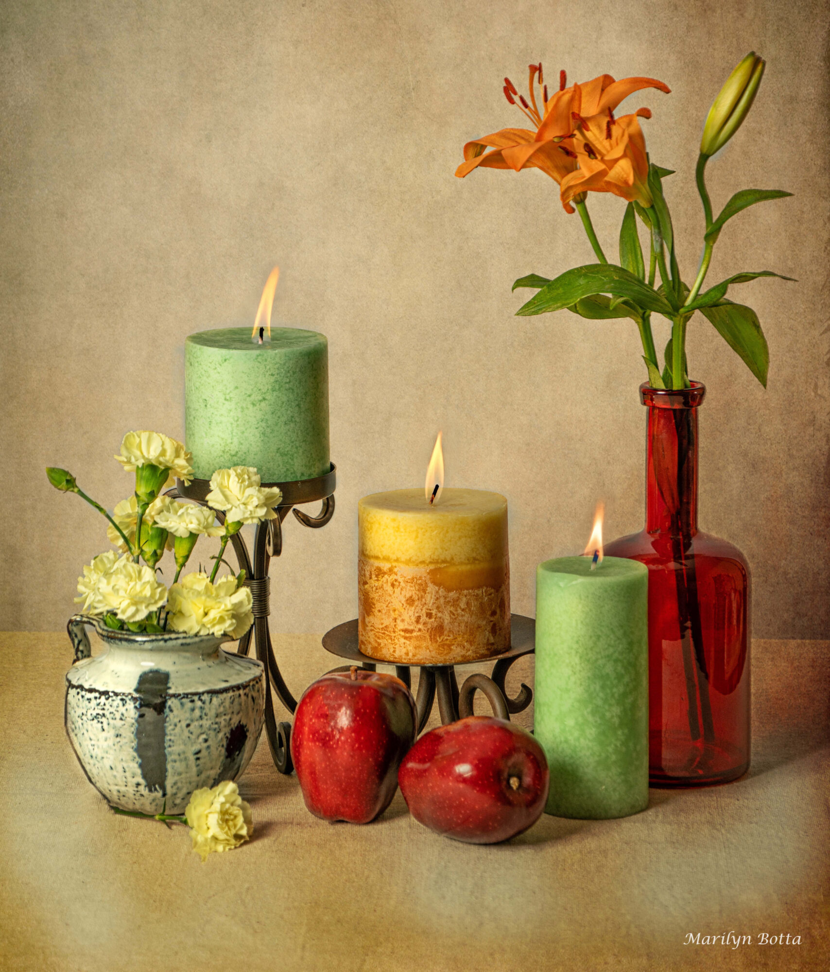 I wanted to create a scene using red on red: I bought a red glass vase and I pared it with two ruby red apples. I created a staircase of candles- each one lower than the previous one. I added beautiful orange lilies to the red vase, I also placed some lovely mini yellow carnations in a small black and white ceramic vase. I added a rustic texture to the background. The scene exudes warmth and calm, complemented by the earthy tones of the setting.