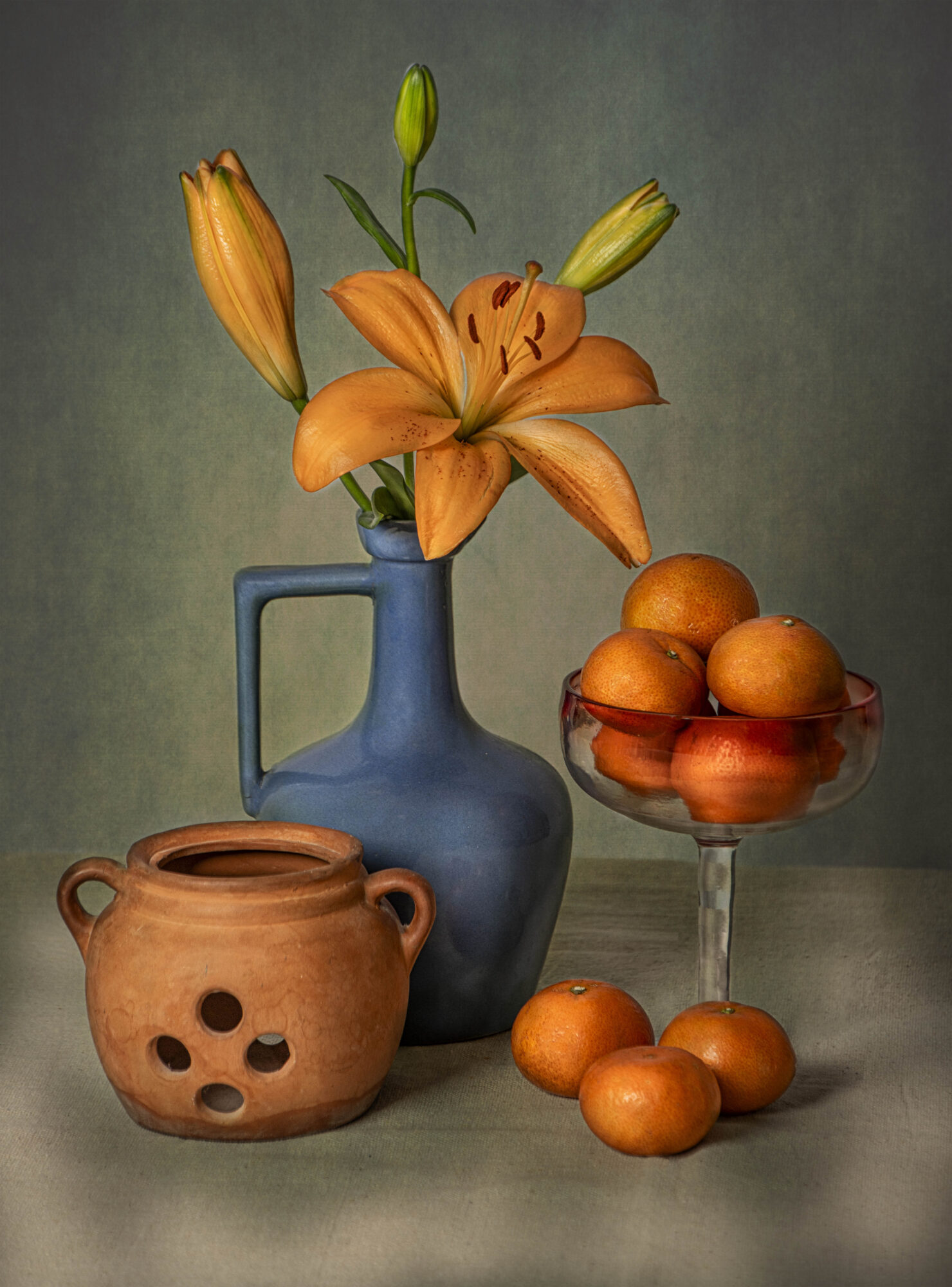 I placed some mandarin oranges into a goblet. I added some gorgeous orange lilies into a blue glass vase. I placed a terracotta pot on the side for a rustic touch. I photographed this against a white backdrop and added textures to give this photo a painted look.