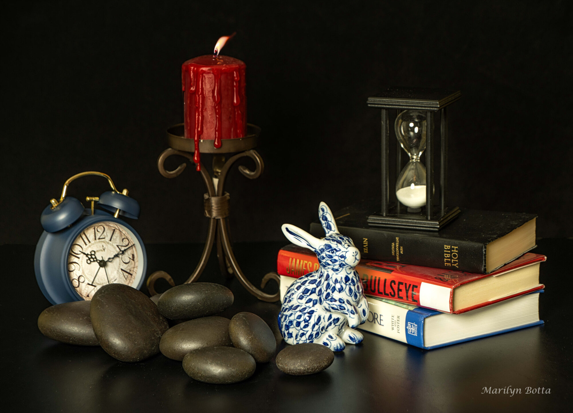 A blue and white porcelain rabbit sits among a still life arrangement of a burning red candle on a candlestick, a pile of hardcover books, a sand hourglass, a blue alarm clock, and smooth black hot stones on a black surface. The composition of objects suggests a theme of time and antiquity, with the juxtaposition of the timeless sculpture and timekeeping devices invoking a sense of history and the fleeting nature of moments.