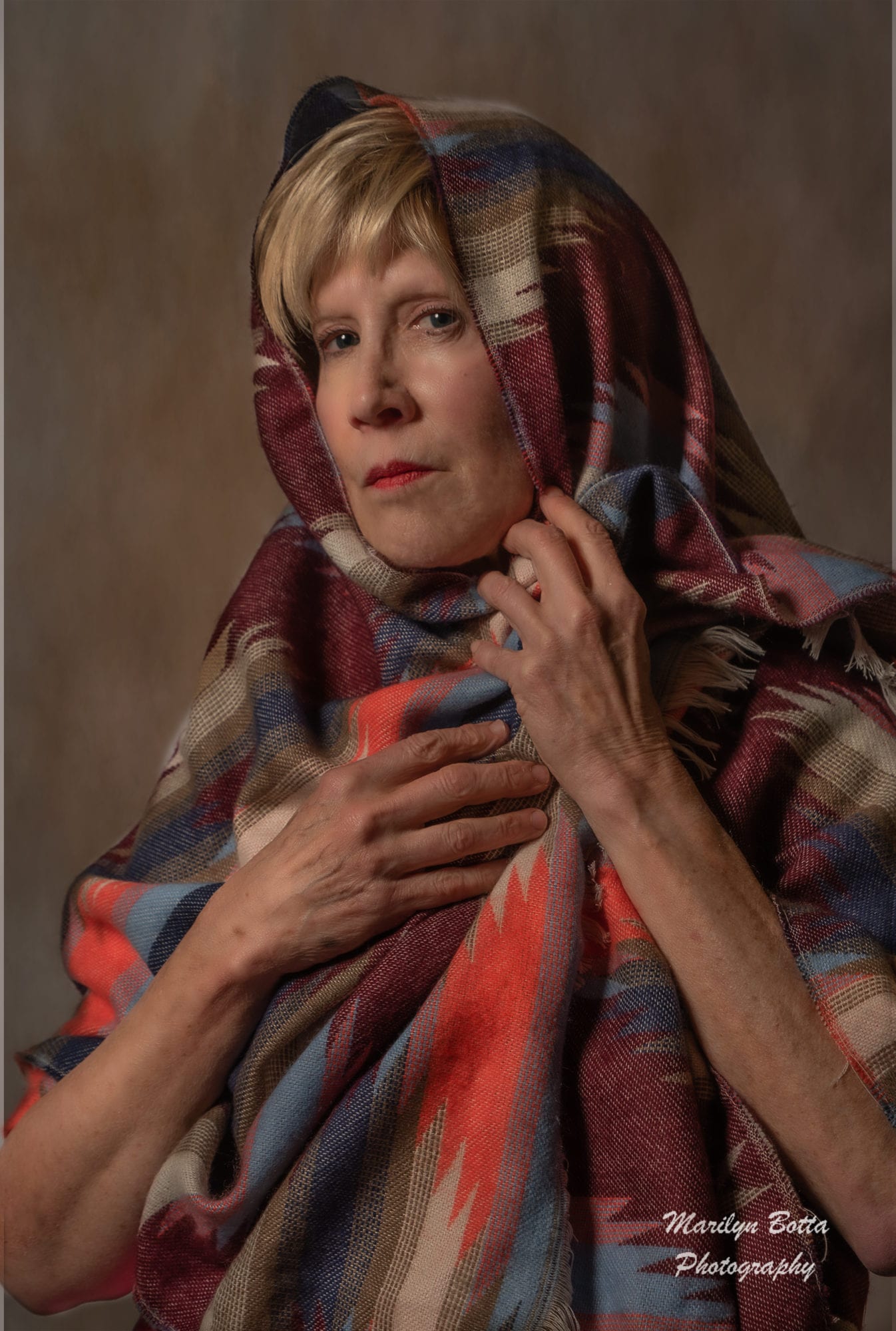 I went to Goodwill, which is my go-to store for finding props for photography. Sometimes I do not find anything unless I am very specific about what I am looking for. But, the other day, I just decided to browse and get inspired in case I found a treasure–and a treasure I did find. All of a sudden I saw this lovely shawl that kind of had a Mexican-like motif. It sort of looked biblical as well. It is really beautiful and I snatched it up for a mere $2.50. So, I had an idea that I would take some self-portraits yet again (since I live alone and it sucks when you want to get images of people) and that was what I had in mind. I wanted the shawl to drape around my head and body. It’s big so I could do it. I thought of draping it around my bald head but decided to put on my wig.