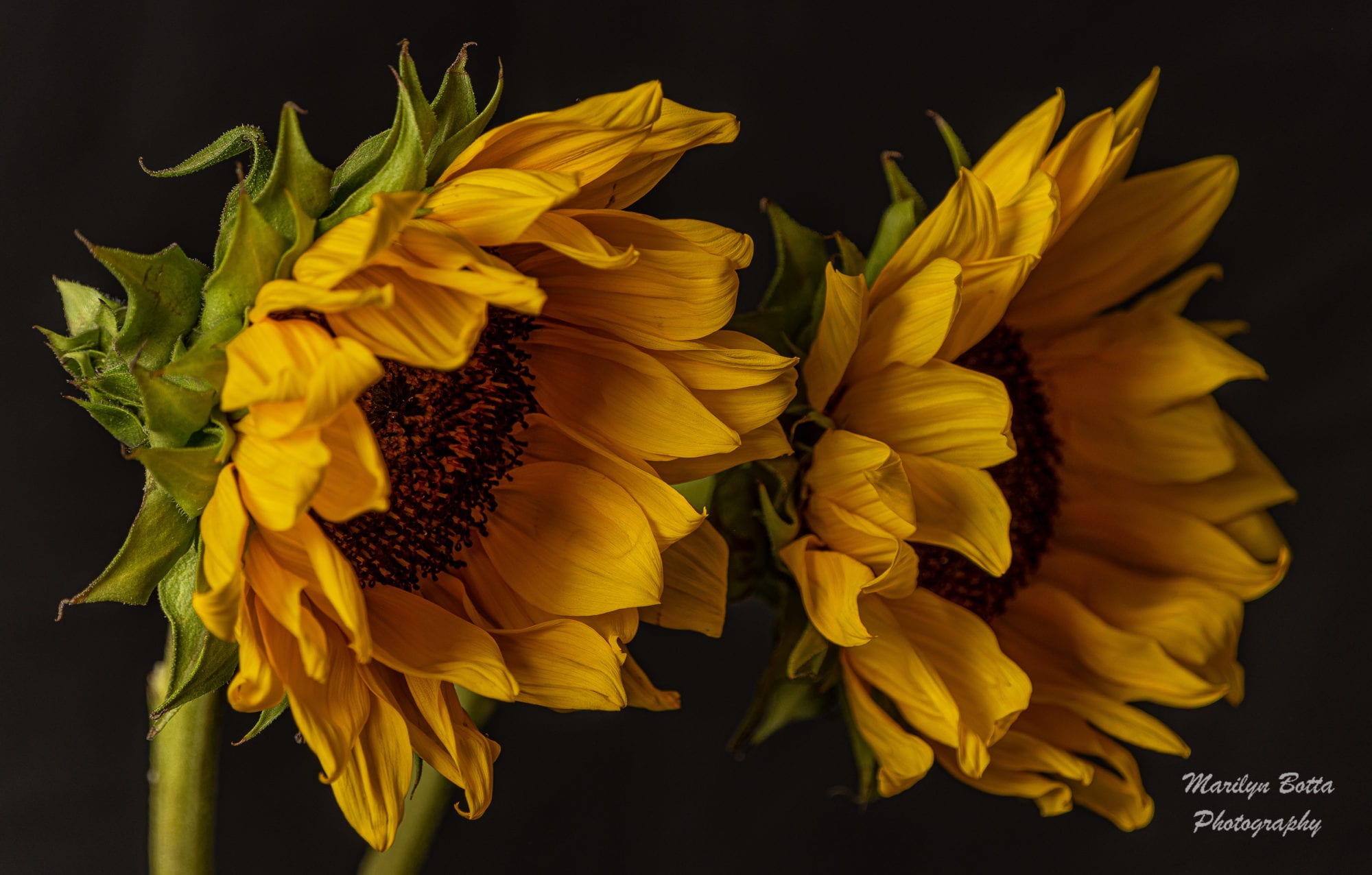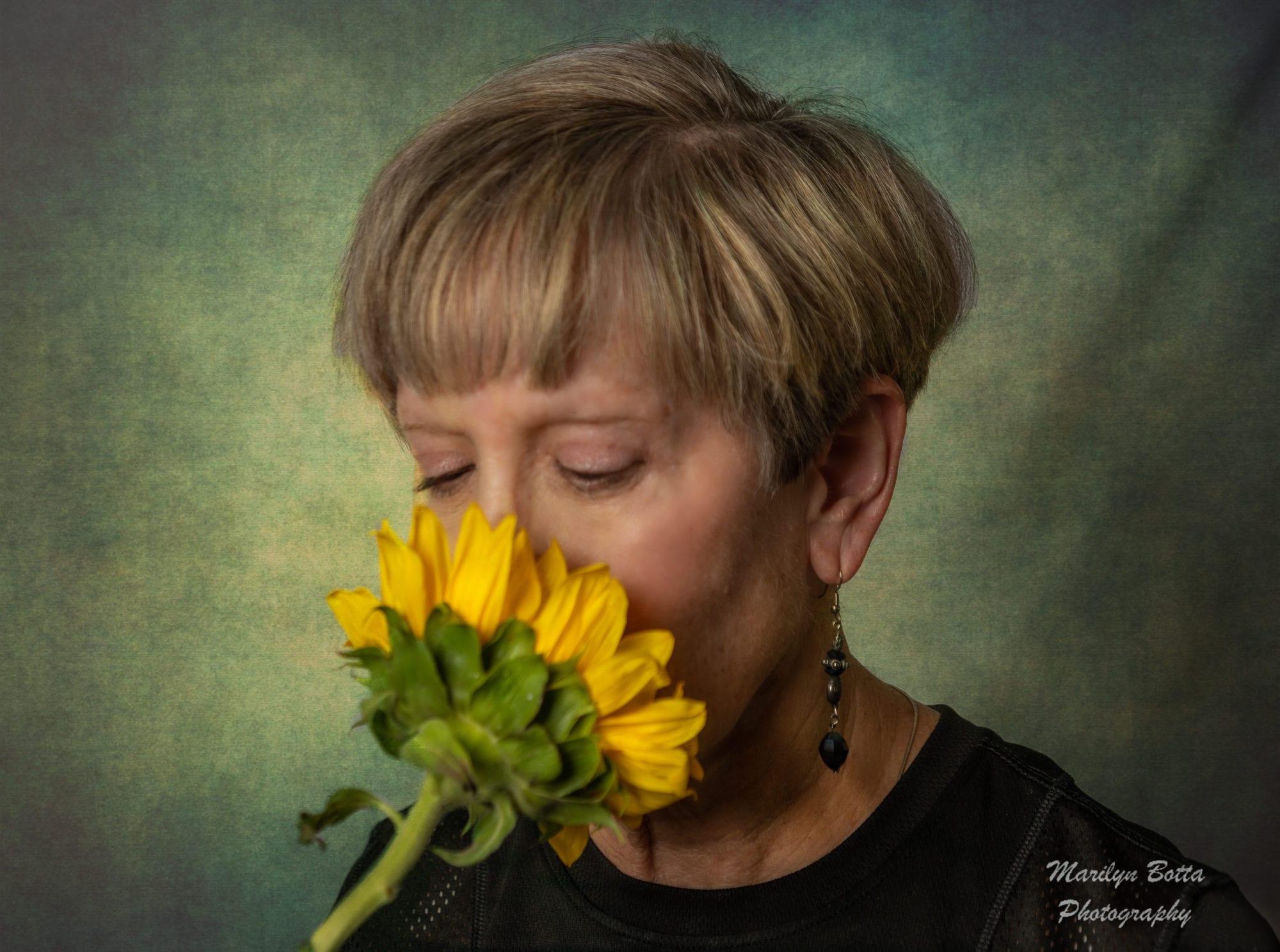 I discovered some gorgeous sunflowers at Kroger recently. I thought they’d make some beautiful photos in the studio. I staged them on a white and then black background. On the white, I added in Photoshop, a texture. On the black background – no texture. I like how they came out. I tried several textures. I even took a self-portrait smelling the sunflower.