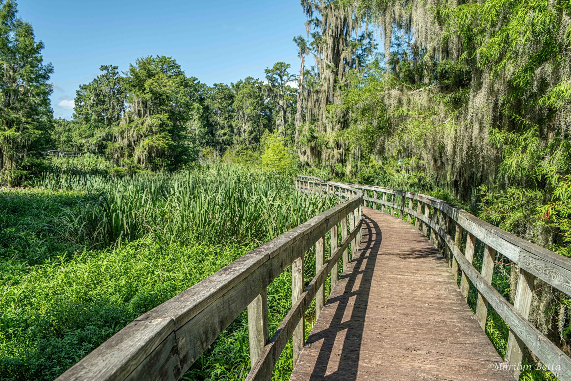 I visited Phinizy Swamp in Augusta, GA, last week. It is a beautiful nature preserve and wetlands. Although it is very lush in the Summer, I still managed to find some gorgeous scenery. It is so peaceful and tranquil along the footbridge, where Spanish moss and lush green trees grow on either side of the bridge. The blue sky was a lovely contrast to the green foliage. The sunlight casts a pattern of shadows on the pathway, enhancing the natural serenity of the scene.